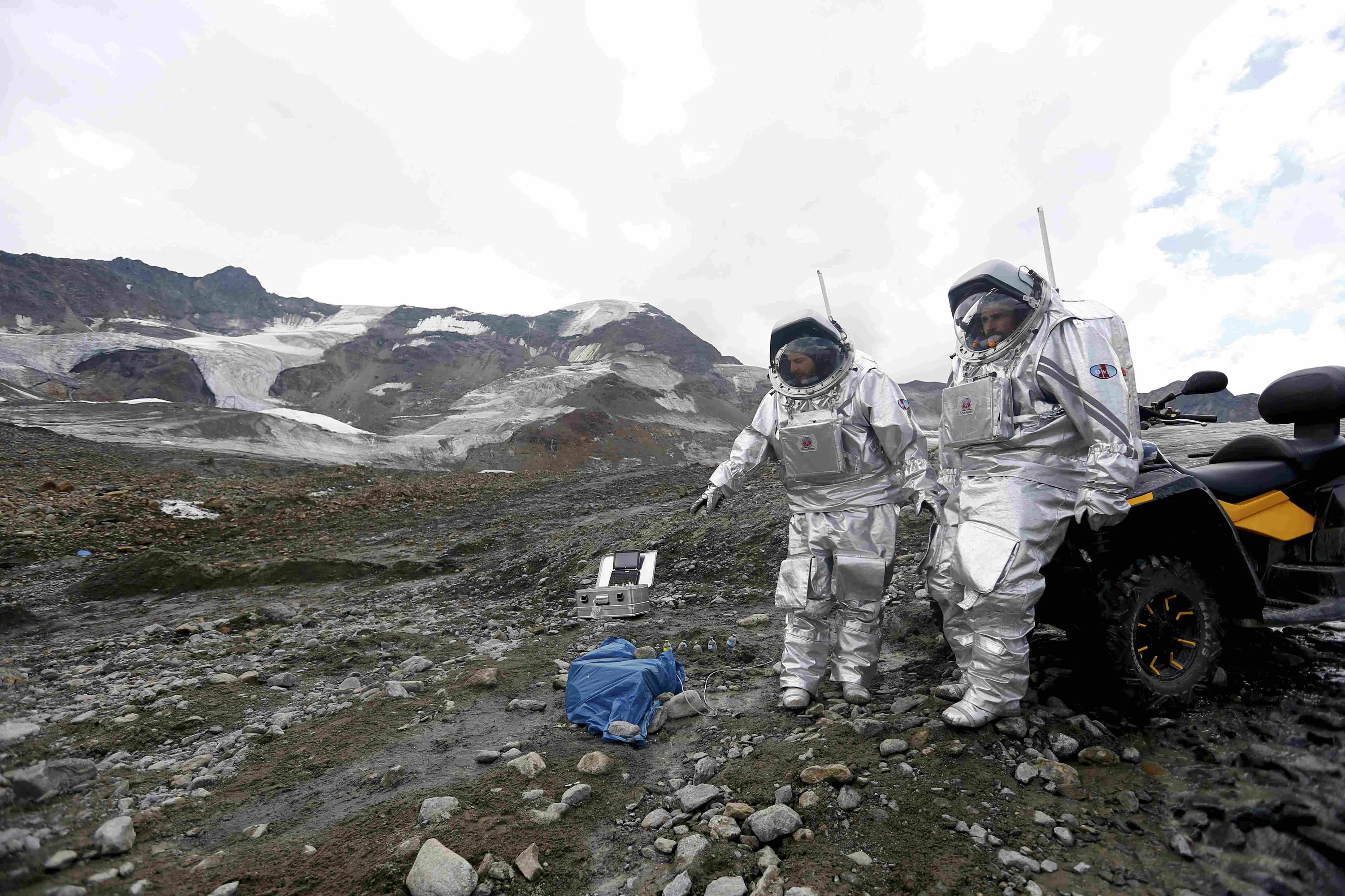 Stefan Dobrovolny of Austria and Inigo Munoz Elorza of Spain (R) stand in front of a quad bike during a simulated Mars mission on Tyrolean glaciers in Kaunertal, Austria, August 7, 2015. The Austrian Space Forum is sending some of its researchers to practice weight-less walking in spacesuits on a glacier which resembles the terrain on Mars. (Photo by Dominic Ebenbichler/Reuters)