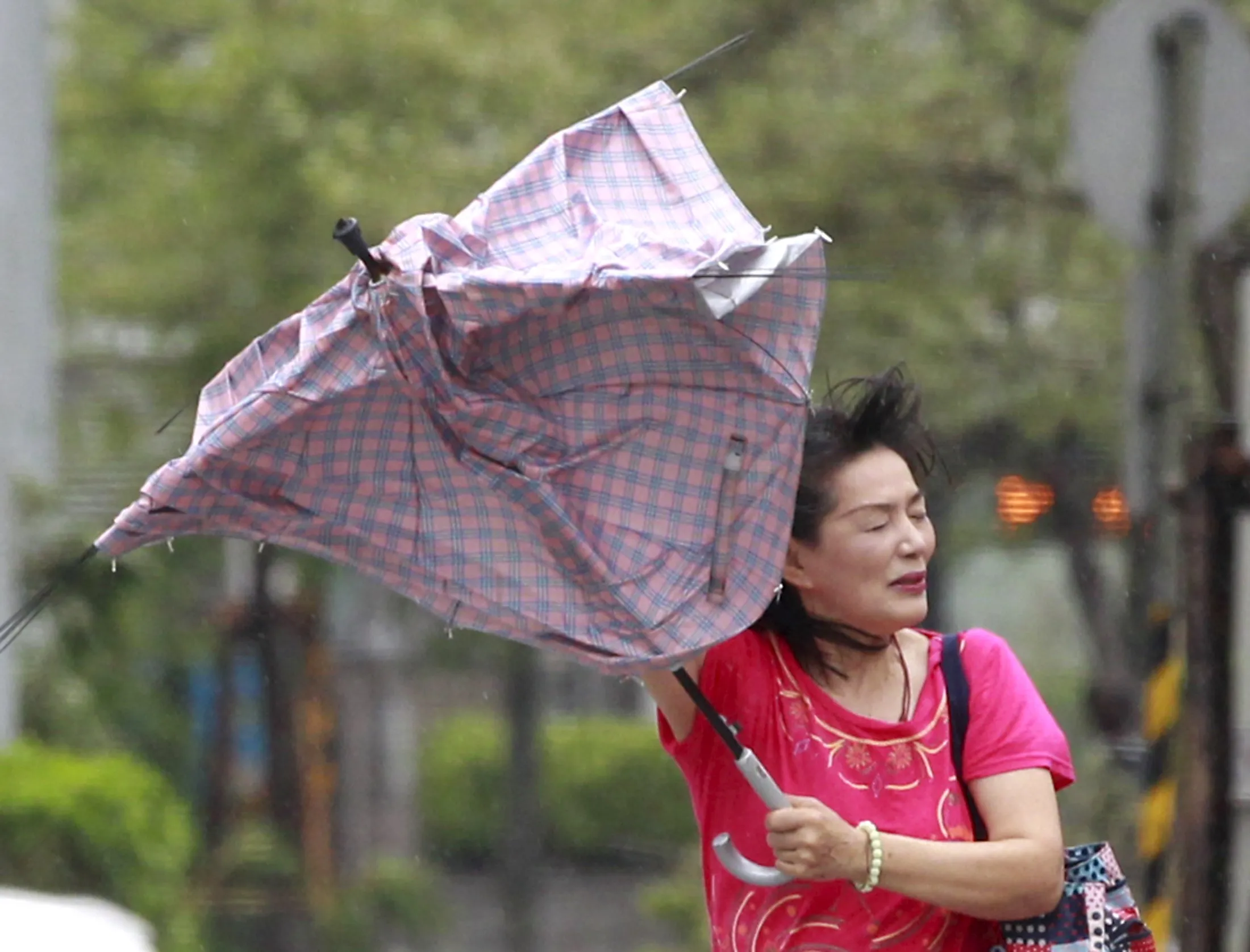 A woman holds her umbrella while walking against strong wind in Taipei as Typhoon Soudelor hits Taiwan August 8, 2015. (Photo by Pichi Chuang/Reuters)