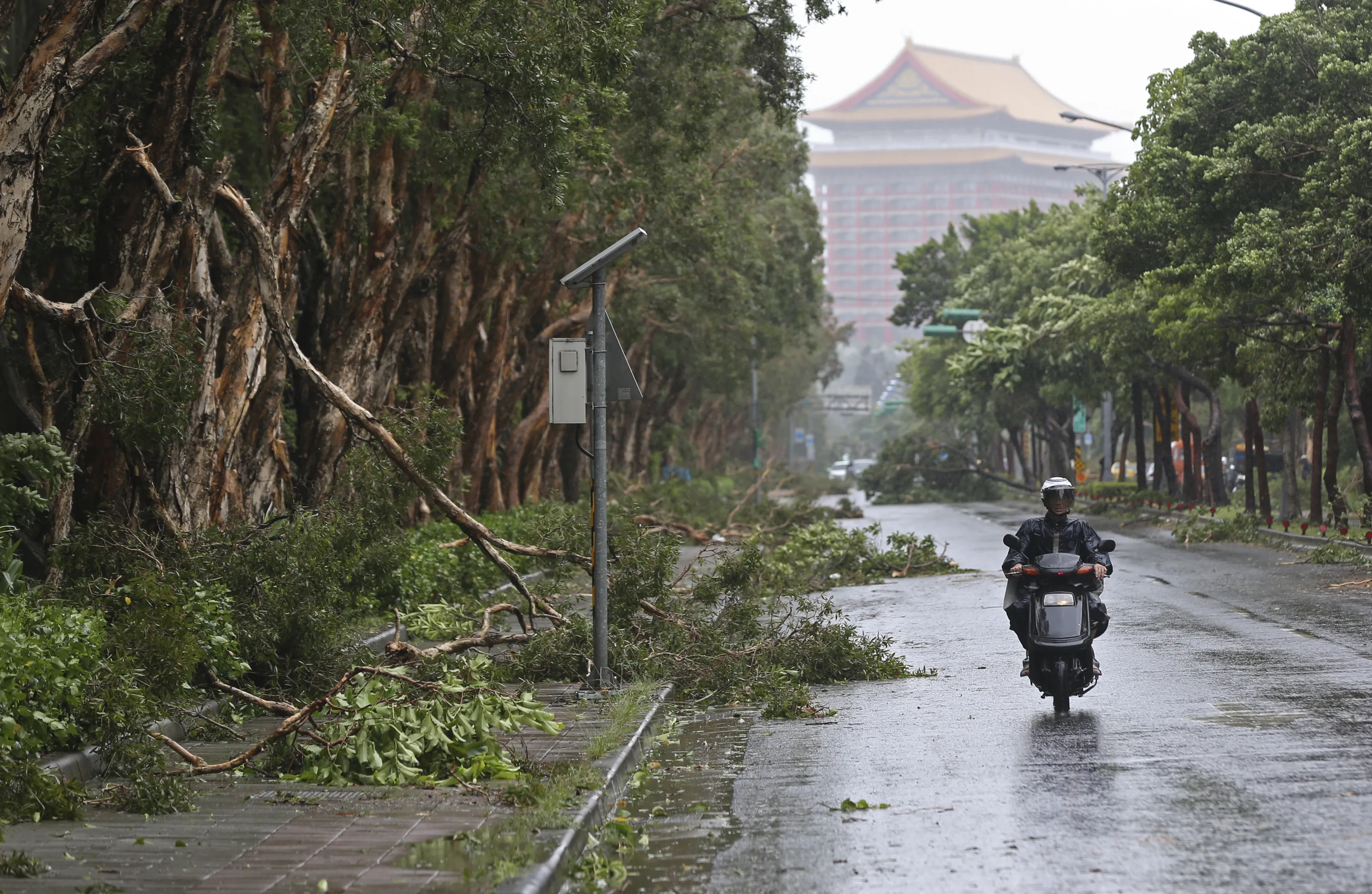 A scooter passes a line of trees brought down by strong winds from Typhoon Soudelor in Taipei, Taiwan, Saturday, August 8, 2015. (Photo by Wally Santana/AP Photo)