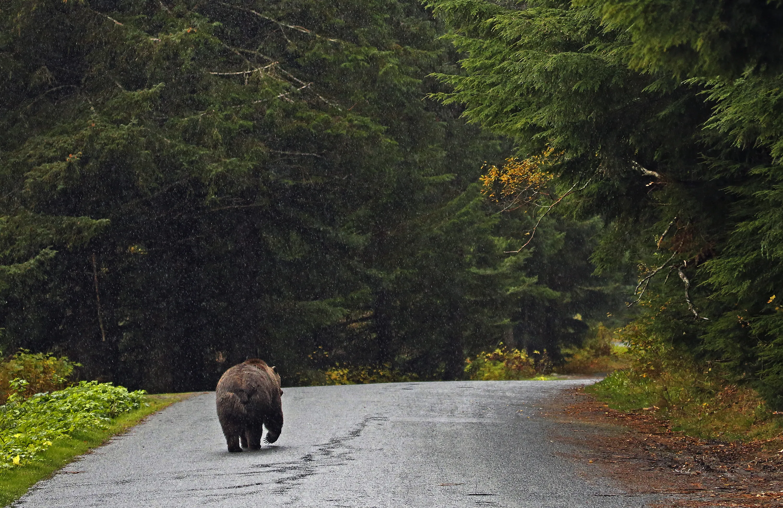 A coastal brown bear walks down a road in the rain next to the Chilkoot River near Haines, Alaska October 9, 2014. (Photo by Bob Strong/Reuters)
