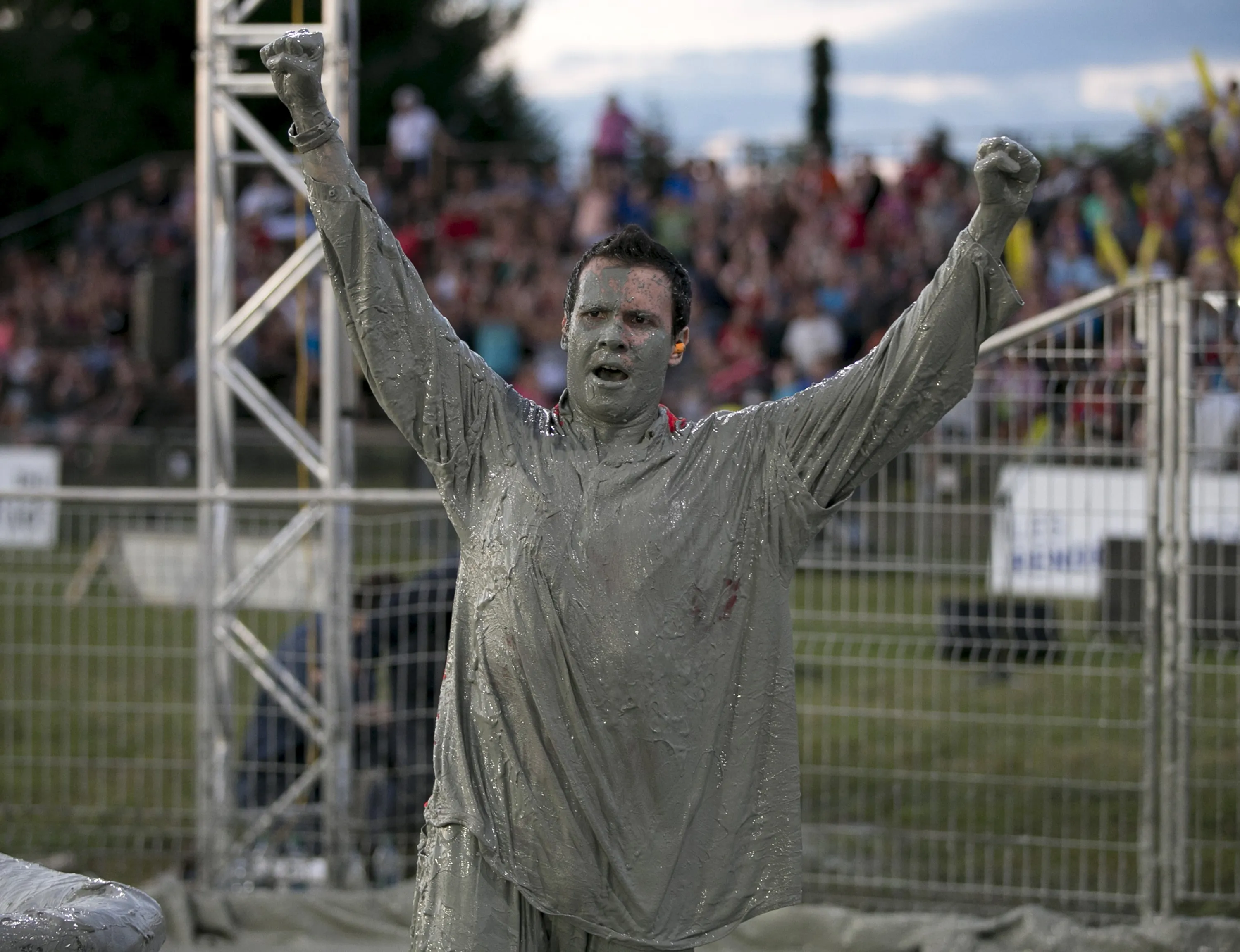 A participant celebrates at the “greased pig contest” at the Festival du Cochon (Pig Festival) in Sainte-Perpetue, Quebec August 8, 2015. (Photo by Christinne Muschi/Reuters)