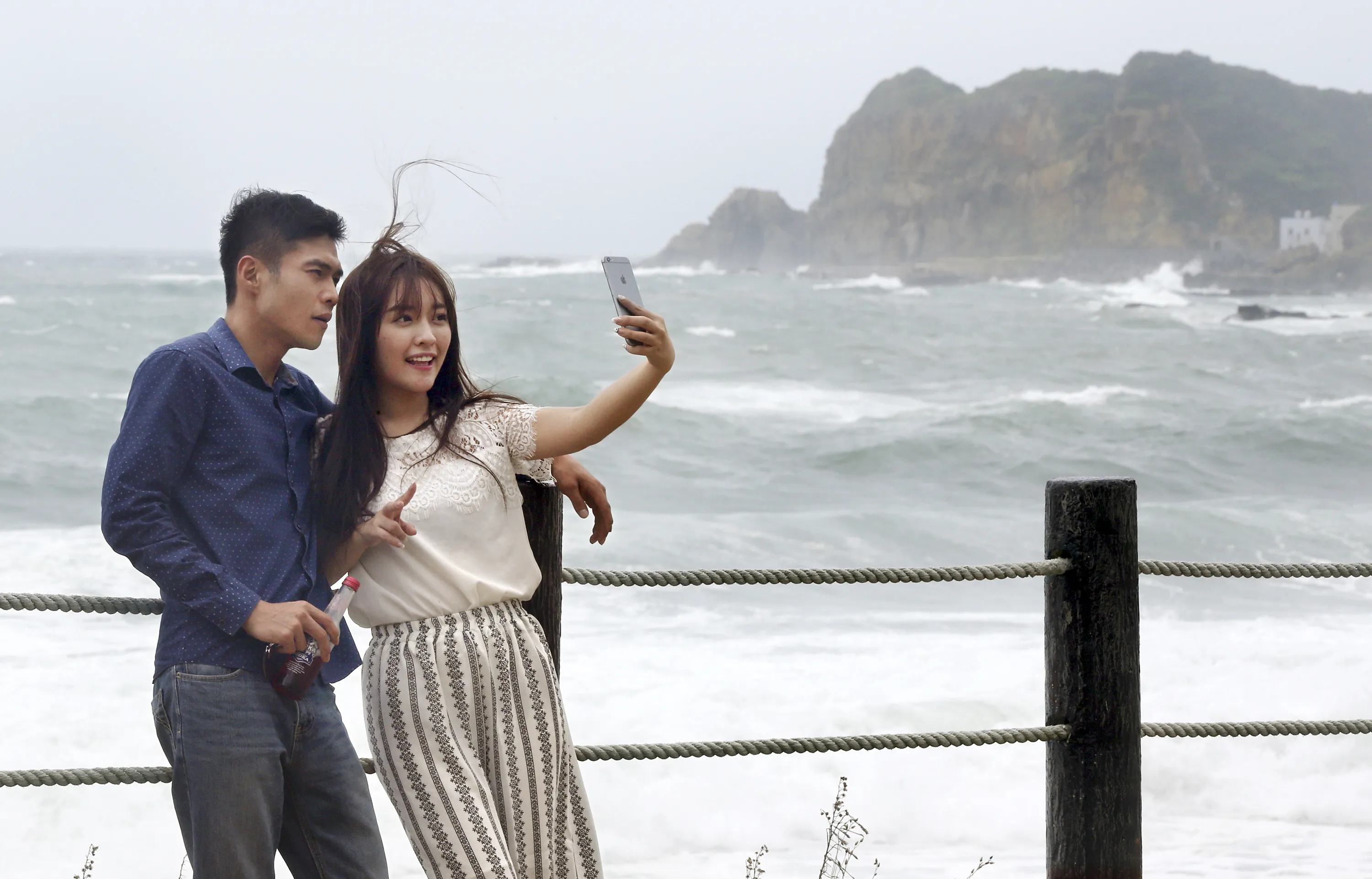 A couple takes a “selfie” photograph in front of the crashing waves from Typhoon Soudelor off the coast of Keelung, northeastern Taiwan, Friday, August 7, 2015. Soudelor is expected to bring heavy rains and strong winds to the island late Friday with winds speeds over 170 km per hour (100 mph) and gusts over 200 km per hour (120 mph) according to Taiwan's Central Weather Bureau. (Photo by Wally Santana/AP Photo)