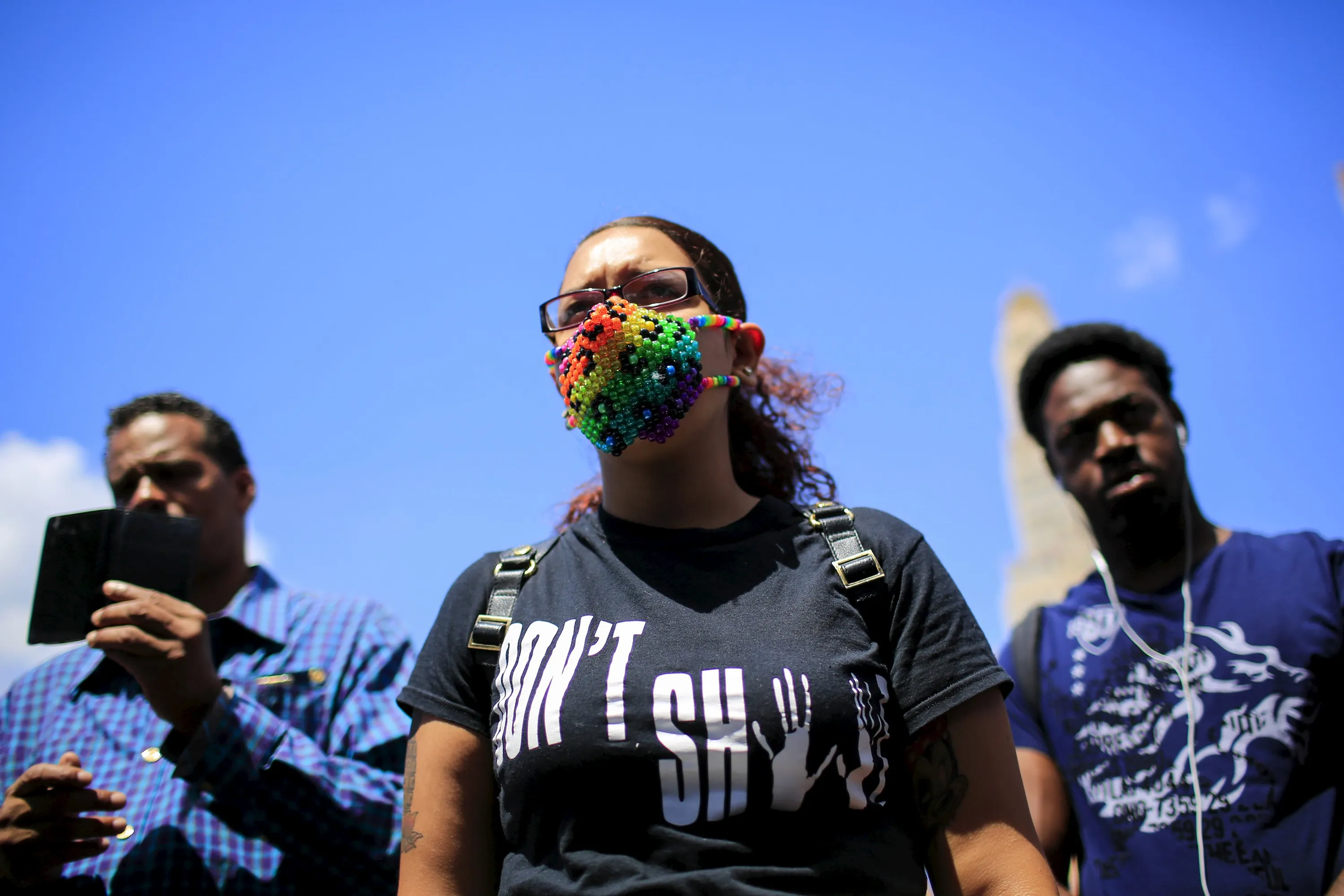 A protester has her face covered while people take part in a rally at Barclays Center marking the first anniversary of the death of Michael Brown, in Brooklyn, New York August 9, 2015. (Photo by Eduardo Munoz/Reuters)