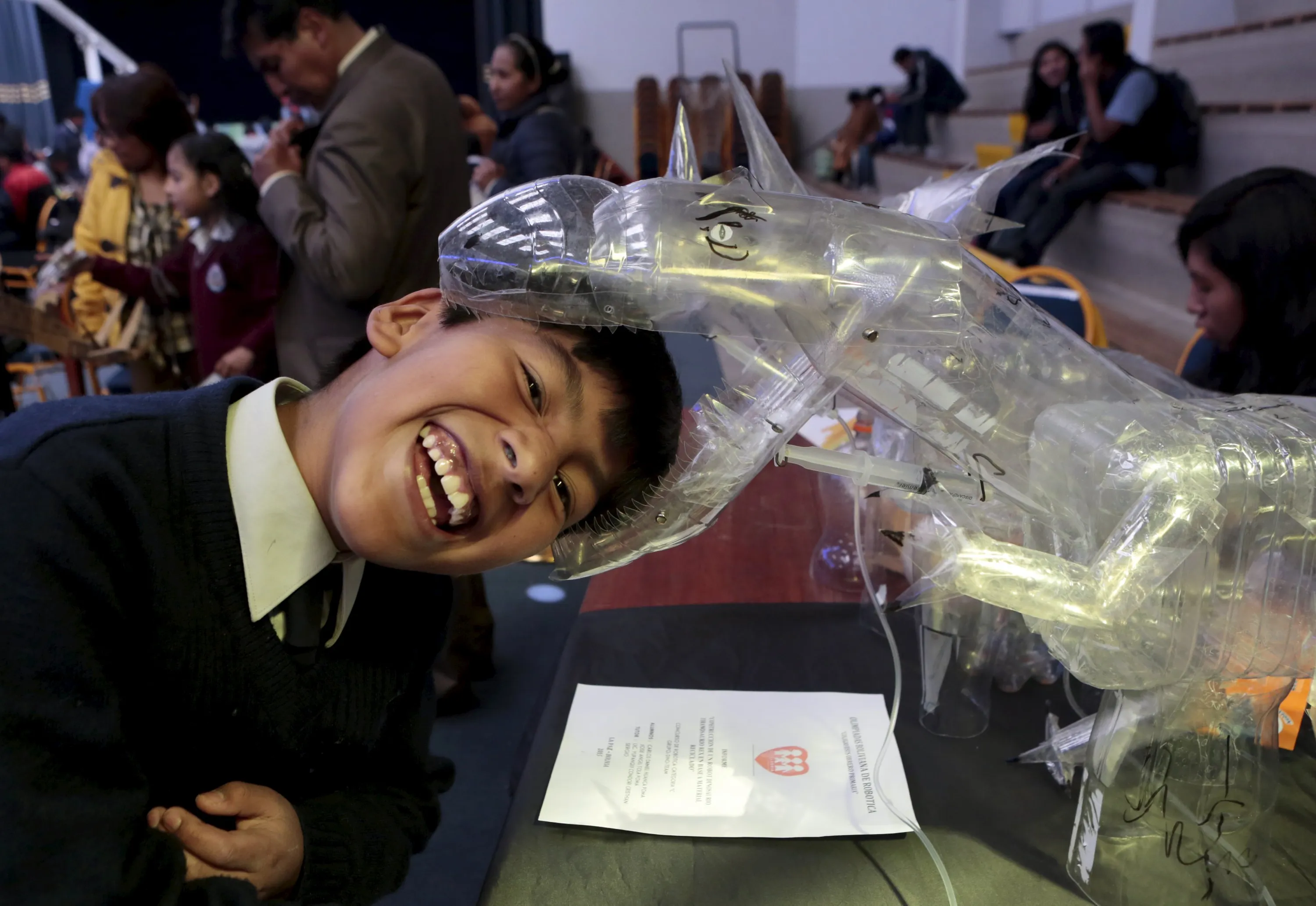 A student jokes with a dinosaur robot built with recycled materials during the annual robotics fair supported by the Bolivian Education Ministry in La Paz, August 10, 2015. (Photo by David Mercado/Reuters)