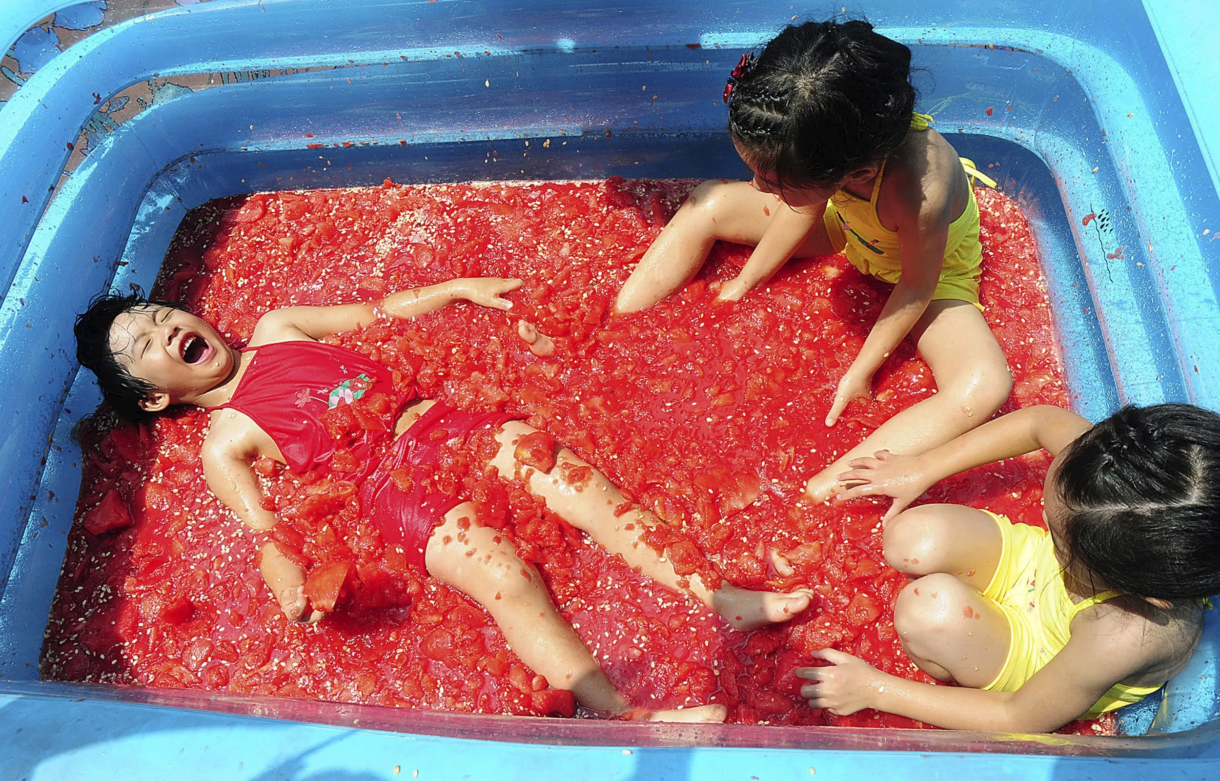 Children play in a inflatable pool filled with smashed watermelons to cool off, at an amusement park in Hangzhou, Zhejiang province, China, July 22, 2015. (Photo by Reuters/Stringer)