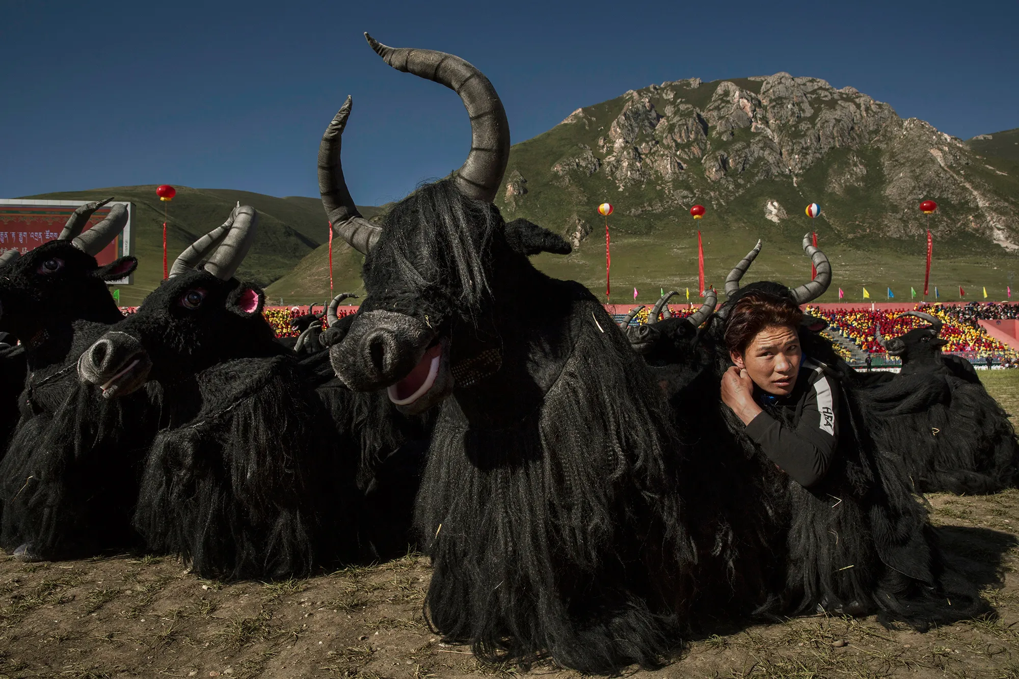 Ethnic Tibetans dressed in Yak costumes wait to perform on July 24, 2015 at a local government sponsored festival on the Tibetan Plateau in Yushu County, Qinghai, China. (Photo by Kevin Frayer/Getty Images)