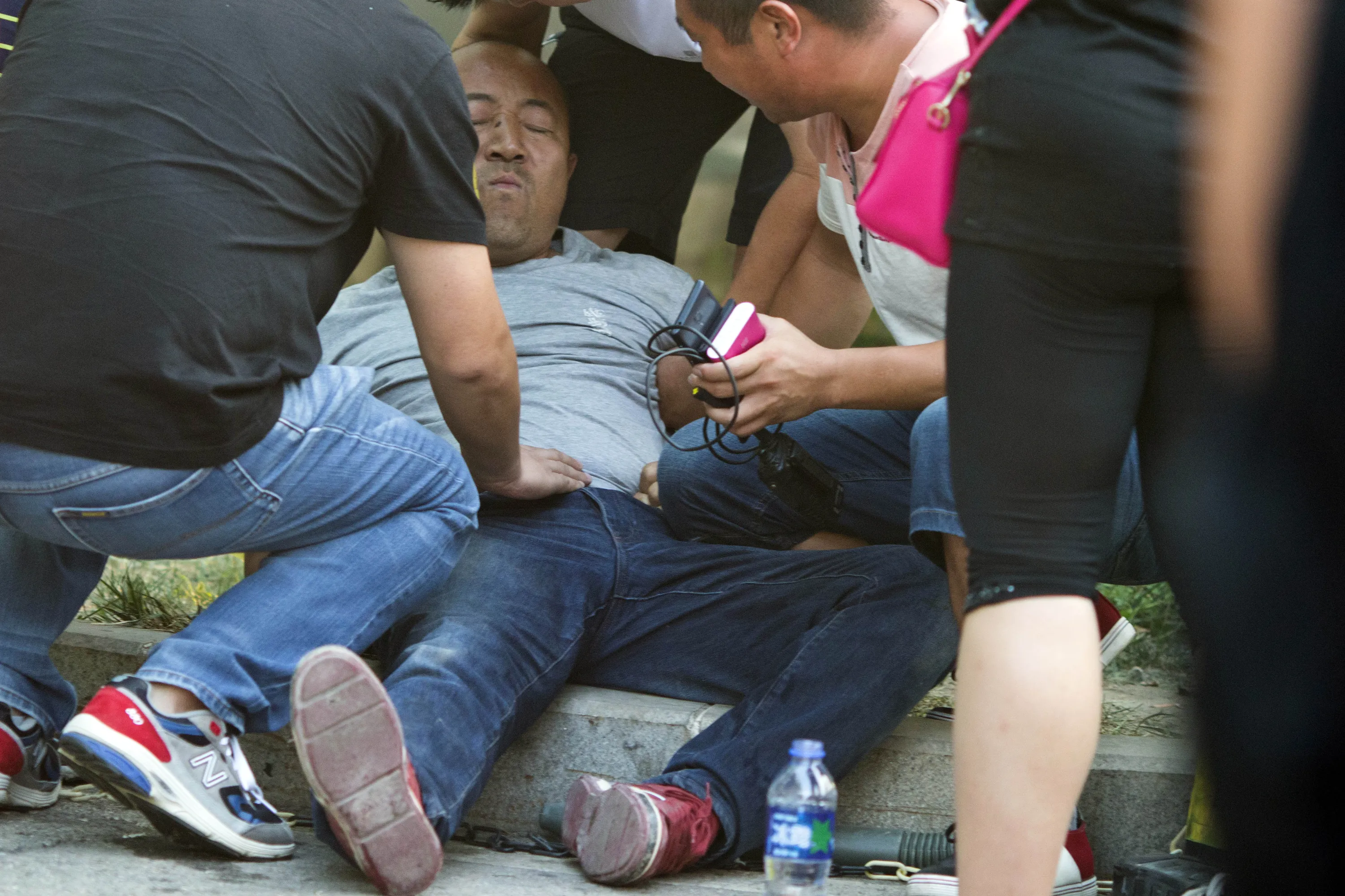 A man crying about the death of his son collapses outside a hospital receiving victims of explosions in northeastern China's Tianjin municipality, Thursday, August 13, 2015. (Photo by Ng Han Guan/AP Photo)