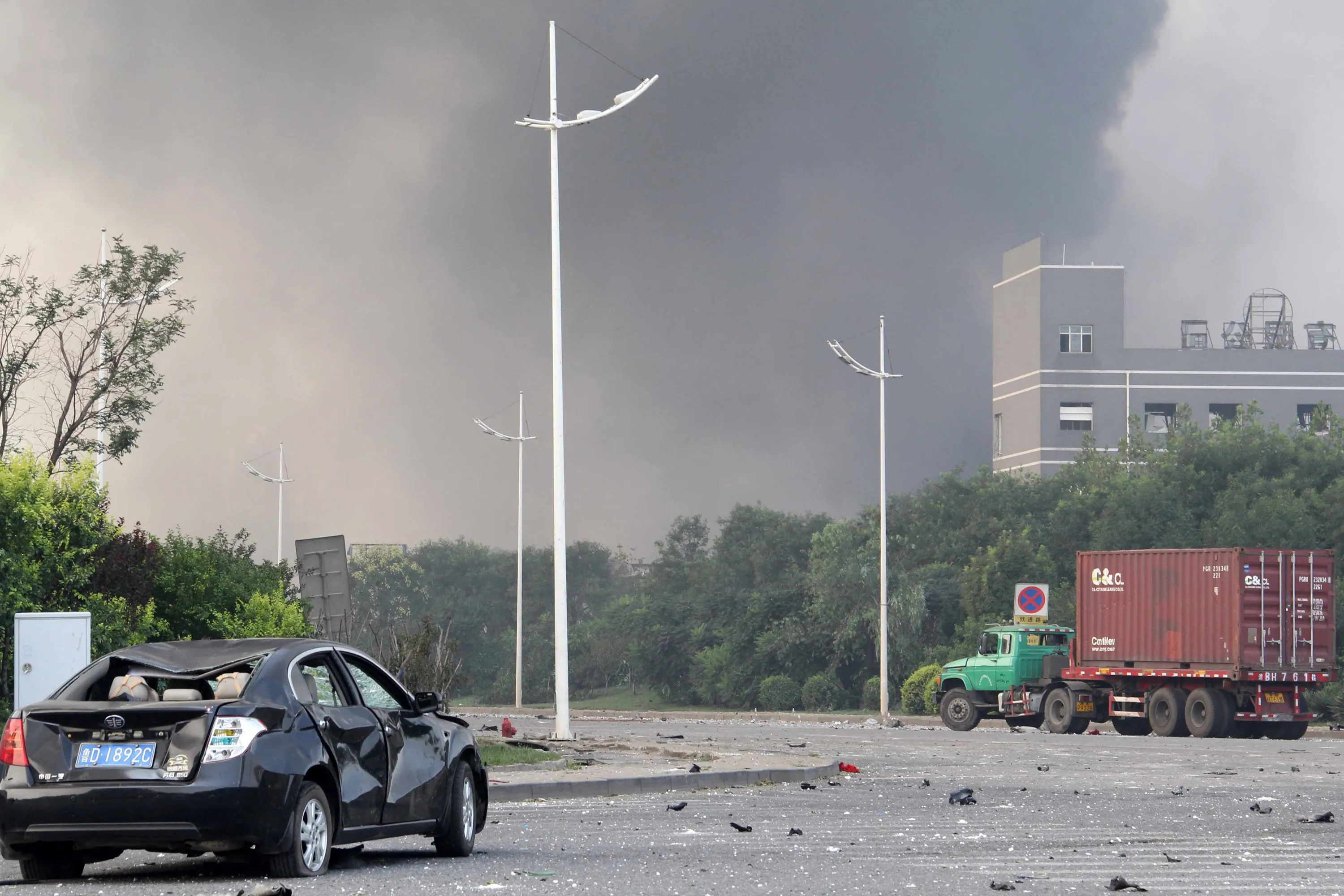 Damaged vehicles are seen as smoke rises from the site of a series of explosions in Tianjin on August 13, 2015. (Photo by AFP Photo)