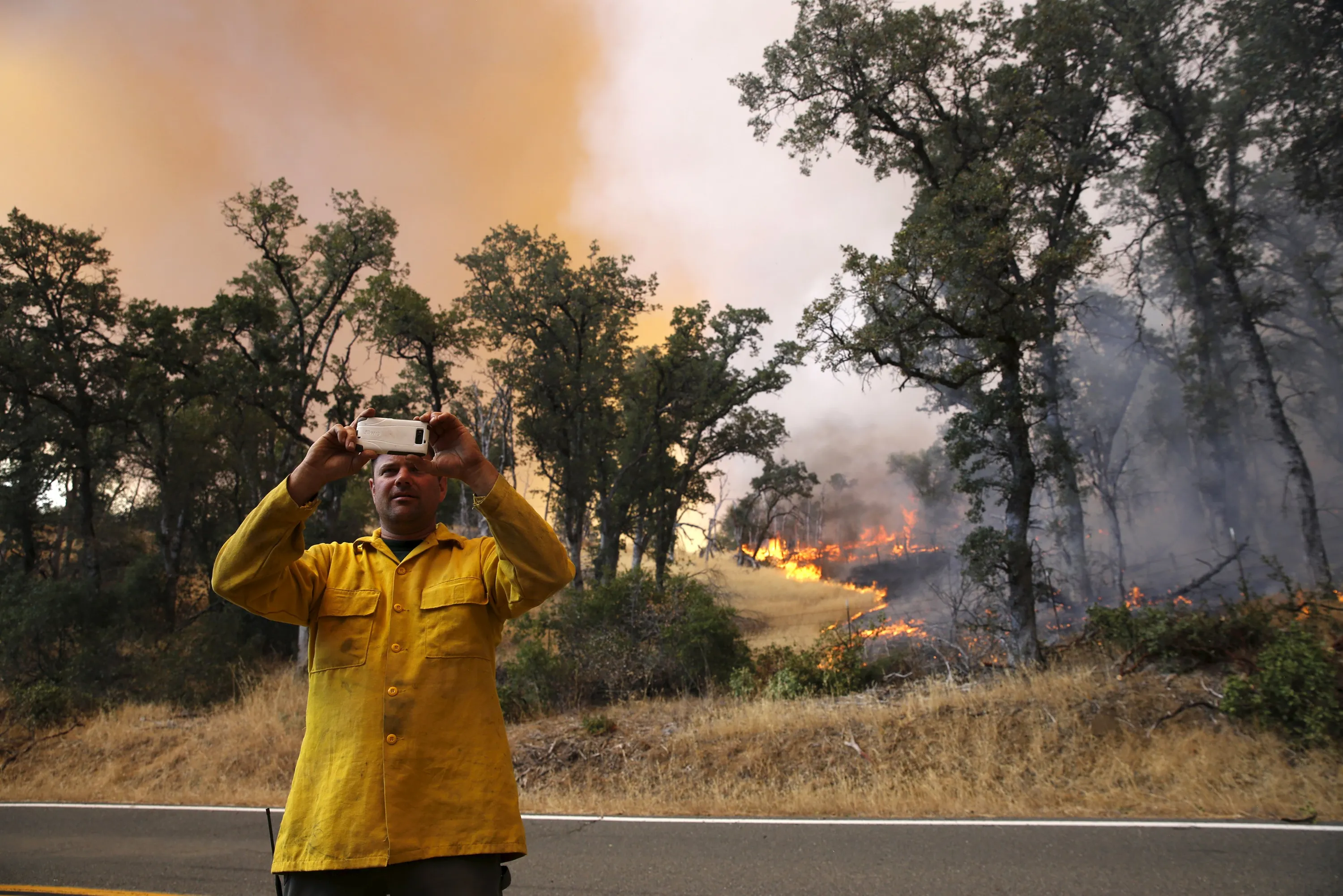 A firefighter snaps a photograph as the so-called Jerusalem Fire burns behind him in Lake County, California, August 12, 2015. (Photo by Robert Galbraith/Reuters)