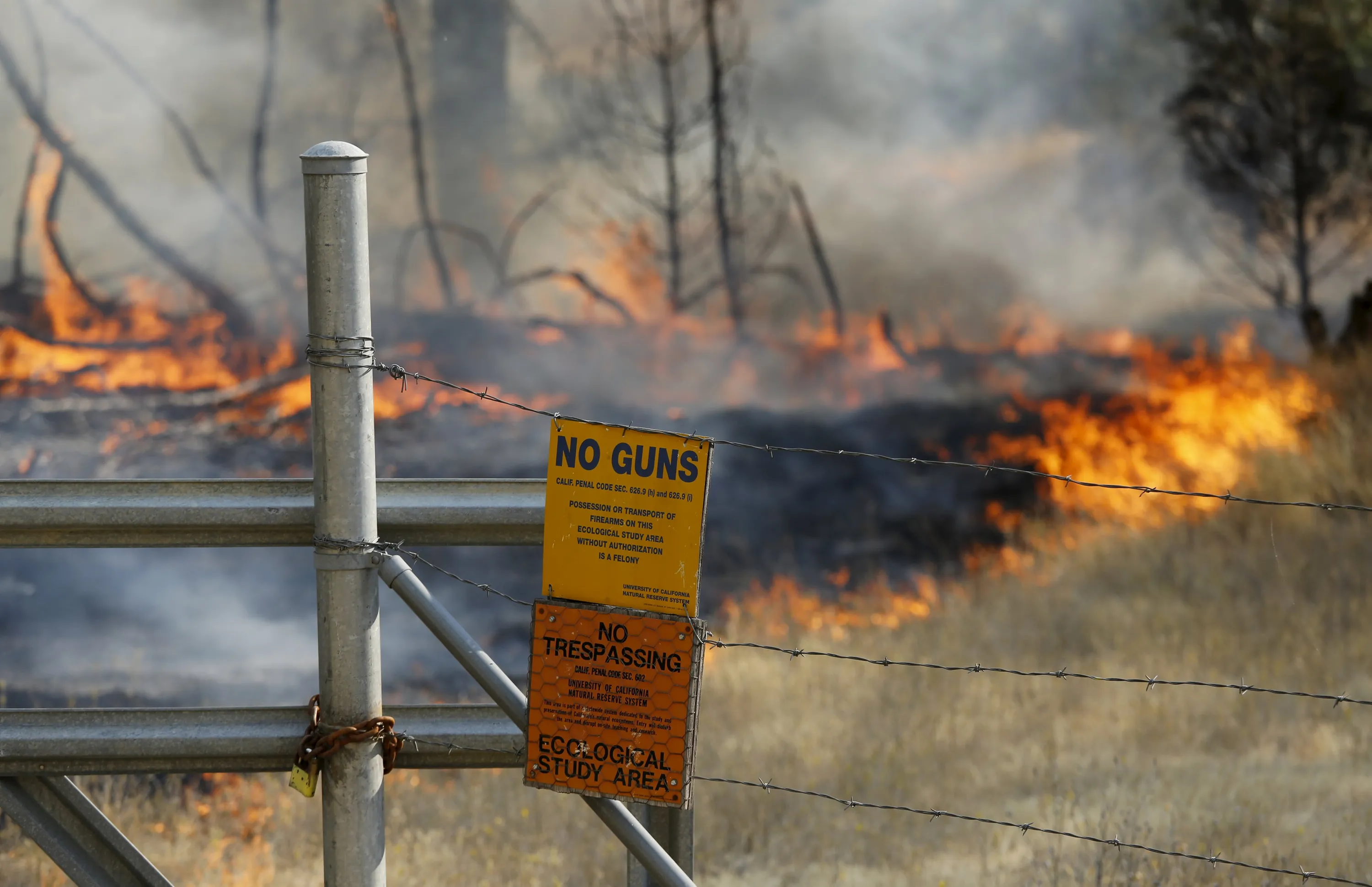 Fire burns near a sign during the so-called Jerusalem Fire in Lake County, California, August 12, 2015. (Photo by Robert Galbraith/Reuters)