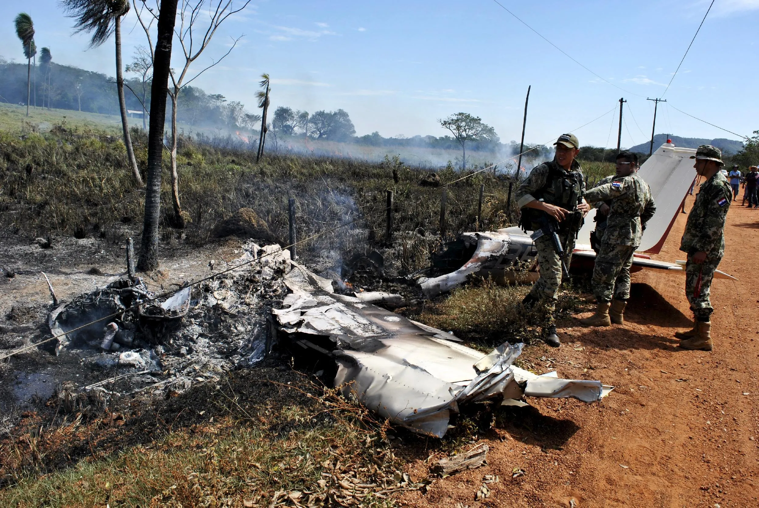 Paraguayan soldiers stand near the smoldering remains of a small plane that had crashed earlier in the rural area of Yby Yau, Paraguay, August 12, 2015. Paraguay's former President Juan Carlos Wasmosy and two other passengers were on the plane when they made an emergency landing, but no fatal victims have been reported, according to local media. Wasmosy was the first civilian president after the end of the 1954-1989 dictatorship. (Photo by Aldo Rojas/Reuters/ABC Journal)