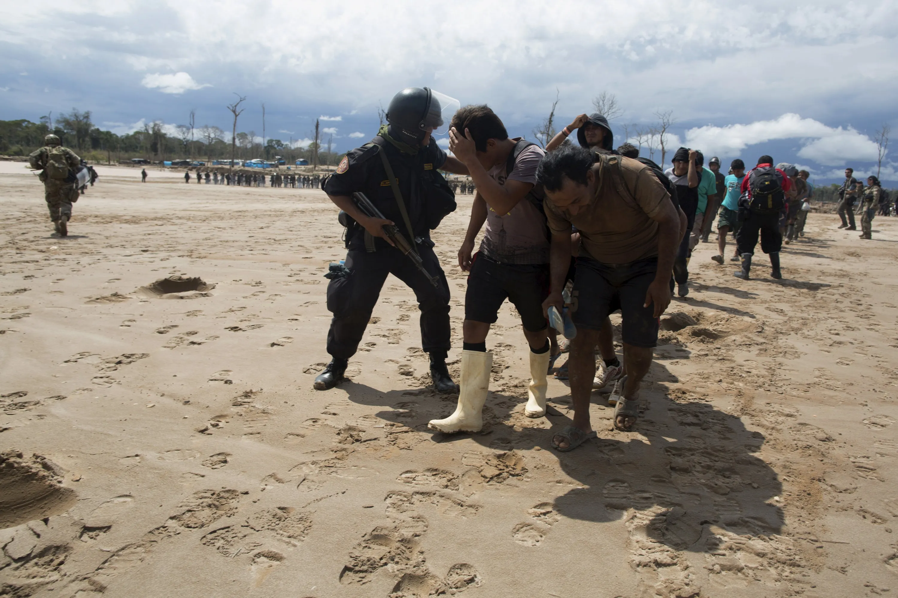 Police escort a group of miners detained during a police operation to destroy illegal gold mining camps in La Pampa, in the southern Amazon region of Madre de Dios, August 11, 2015. (Photo by Sebastian Castaneda/Reuters)