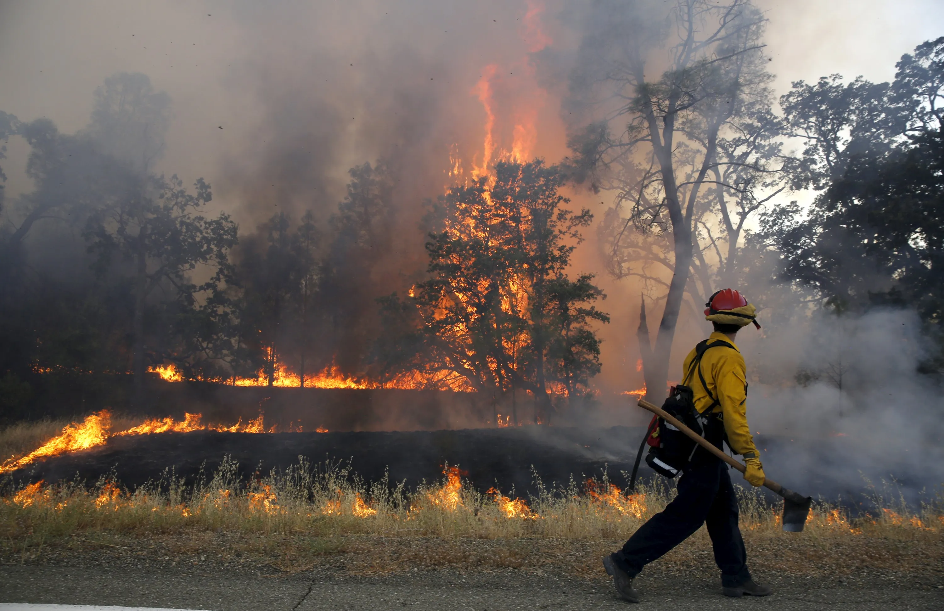 A firefighter walks past flames from the Jerusalem Fire in Lake County, California August 13, 2015. (Photo by Robert Galbraith/Reuters)