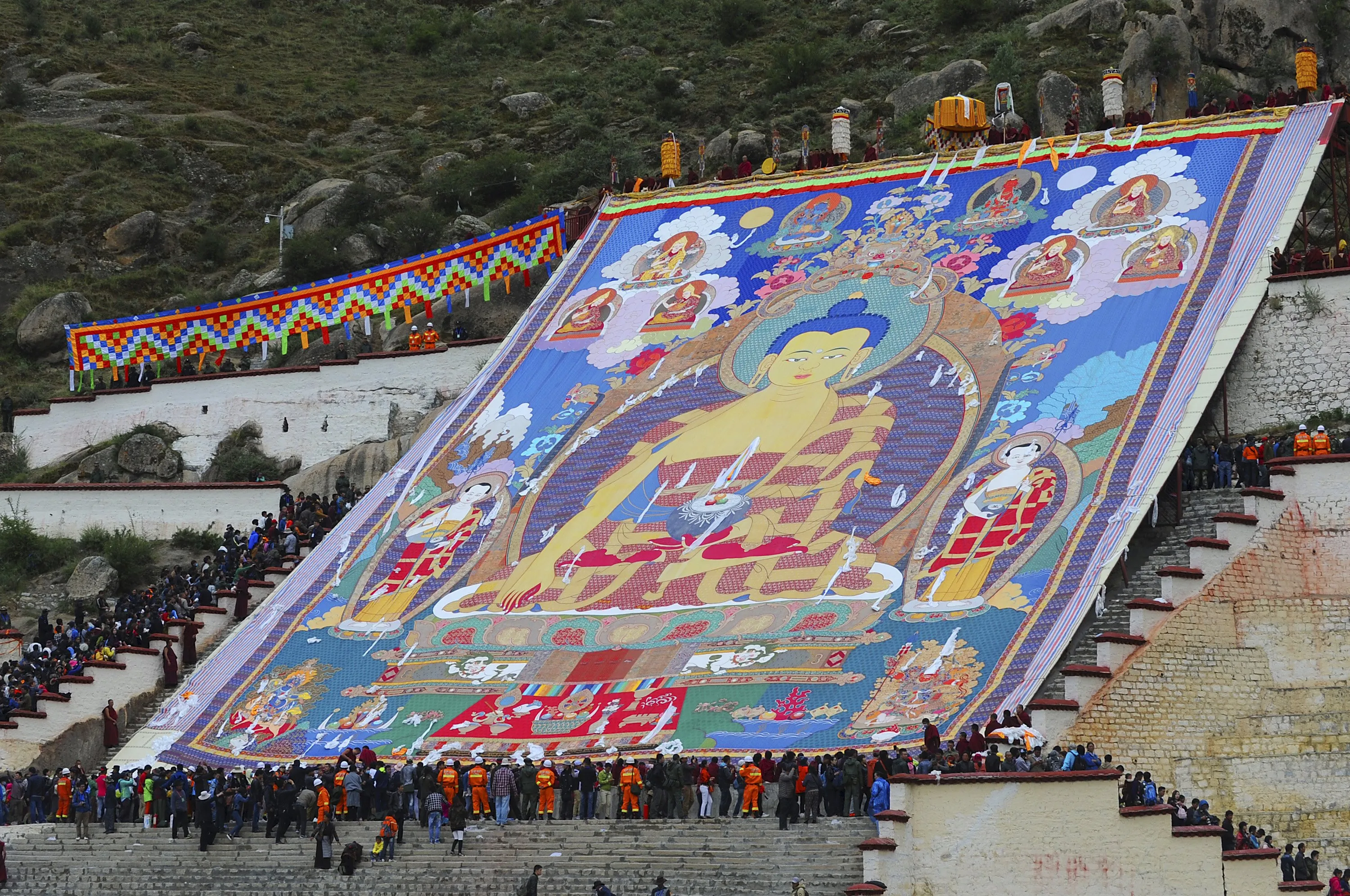Tibetan Buddhists and tourists view a huge Thangka, a religious silk embroidery or painting displaying a Buddha portrait, during the Shoton Festival at Drepung Monastery in Lhasa, Tibet Autonomous Region, China, August 14, 2015. (Photo by Reuters/China Daily)
