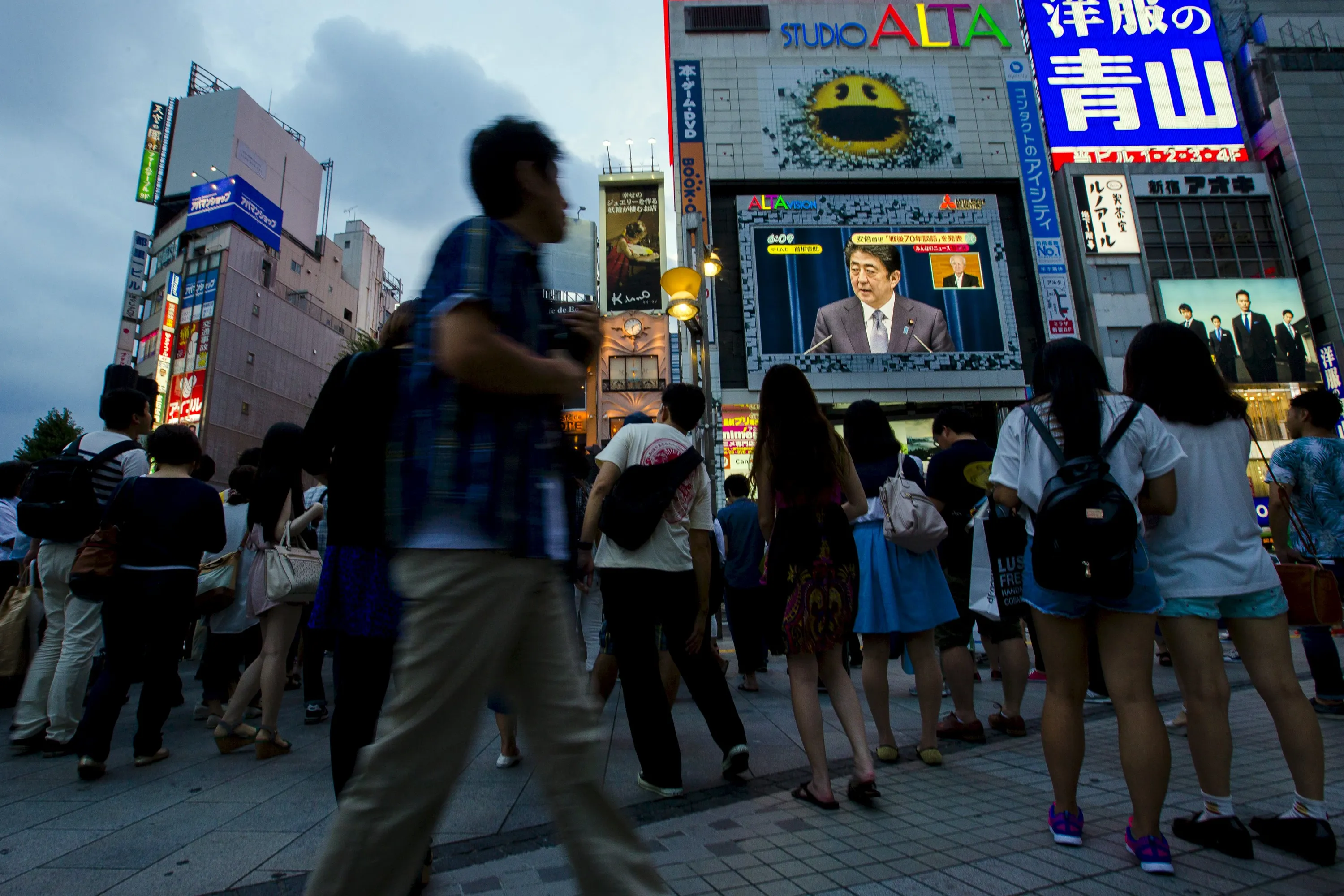 People watch Japan's Prime Minister Shinzo Abe on a screen as he gives a statement in Tokyo August 14, 2015. Prime Minister Shinzo Abe, in a statement marking the 70th anniversary of World War Two's end, acknowledged Japan had inflicted “immeasurable damage and suffering” on innocent people but said generations not involved in the conflict should not be burdened with continued apologies. (Photo by Thomas Peter/Reuters)