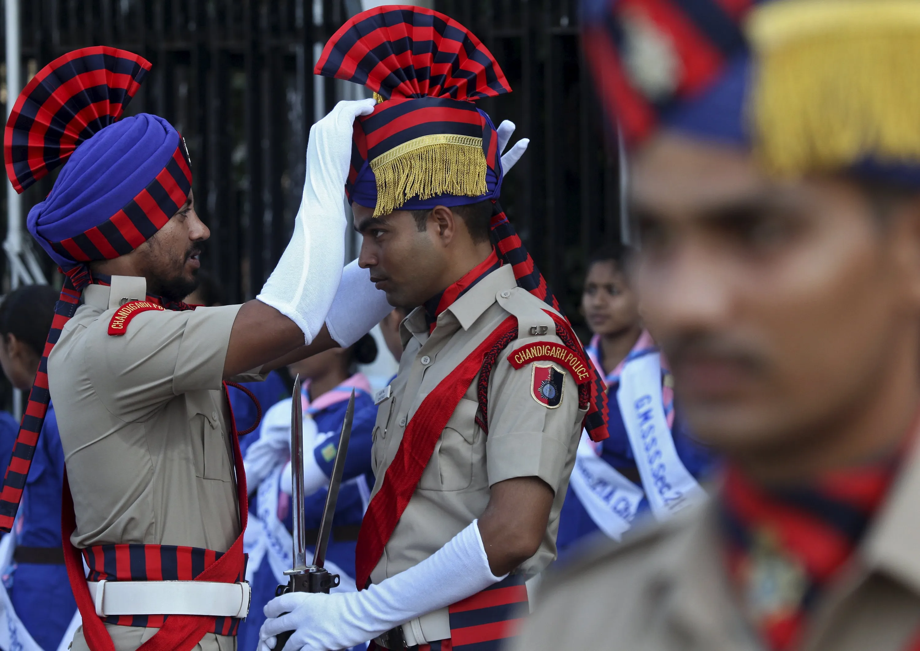 An Indian policeman adjusts his colleague's headdress during the full-dress rehearsal for India's Independence Day celebrations in Chandigarh, India, August 13, 2015. (Photo by Ajay Verma/Reuters)