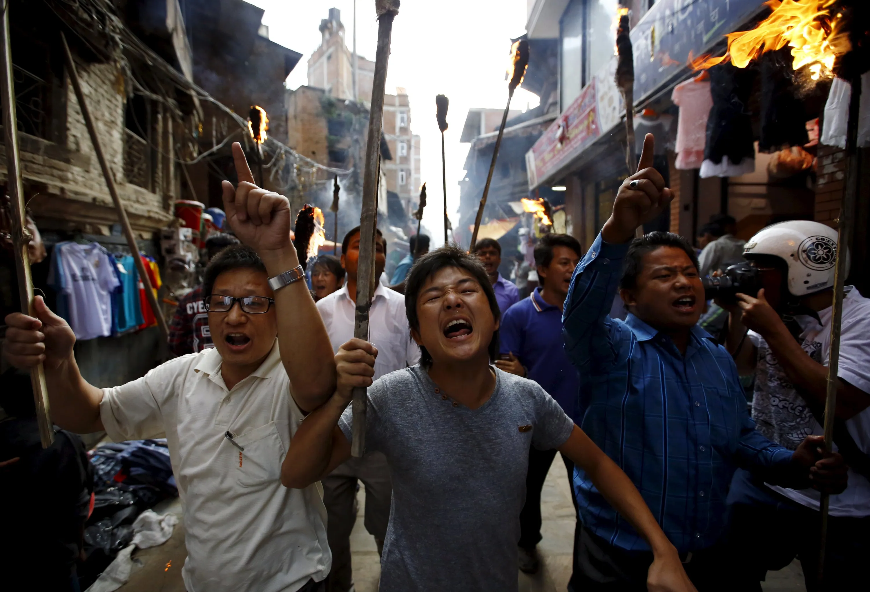 Protesters chant slogans during a torch rally organised by the 30-party alliance led by a hardline faction of former Maoist rebels, who are protesting against the draft of the new constitution, in Kathmandu August 15, 2015. The group says that the draft is not inclusive and does not protect the rights of the marginalised and underprivileged groups in the country. (Photo by Navesh Chitrakar/Reuters)