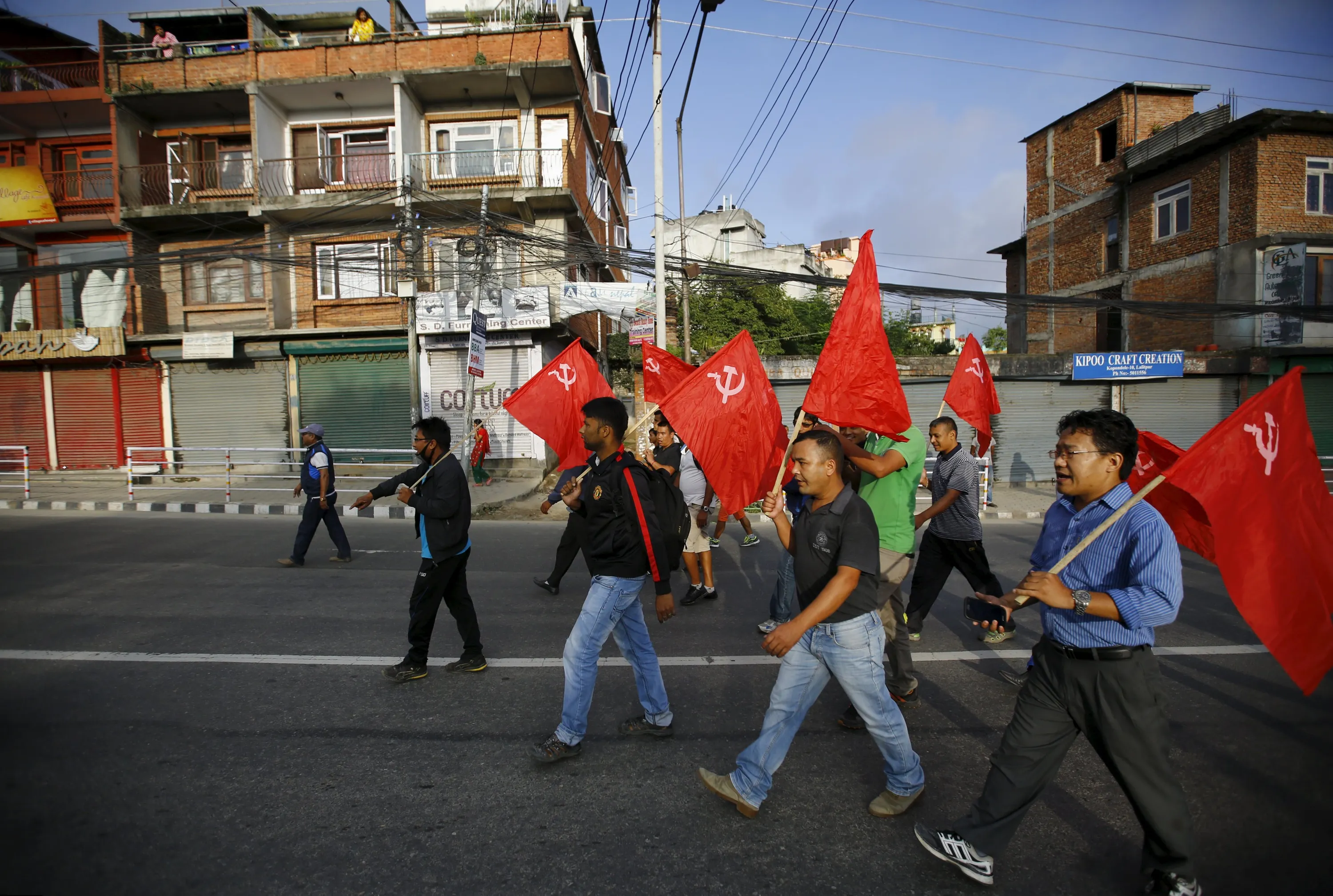Protesters carrying party flags march on the road during a general strike organised by a 30-party alliance led by a hardline faction of former Maoist rebels, who are protesting against the draft of the new constitution, in Lalitpur, Nepal August 16, 2015. (Photo by Navesh Chitrakar/Reuters)