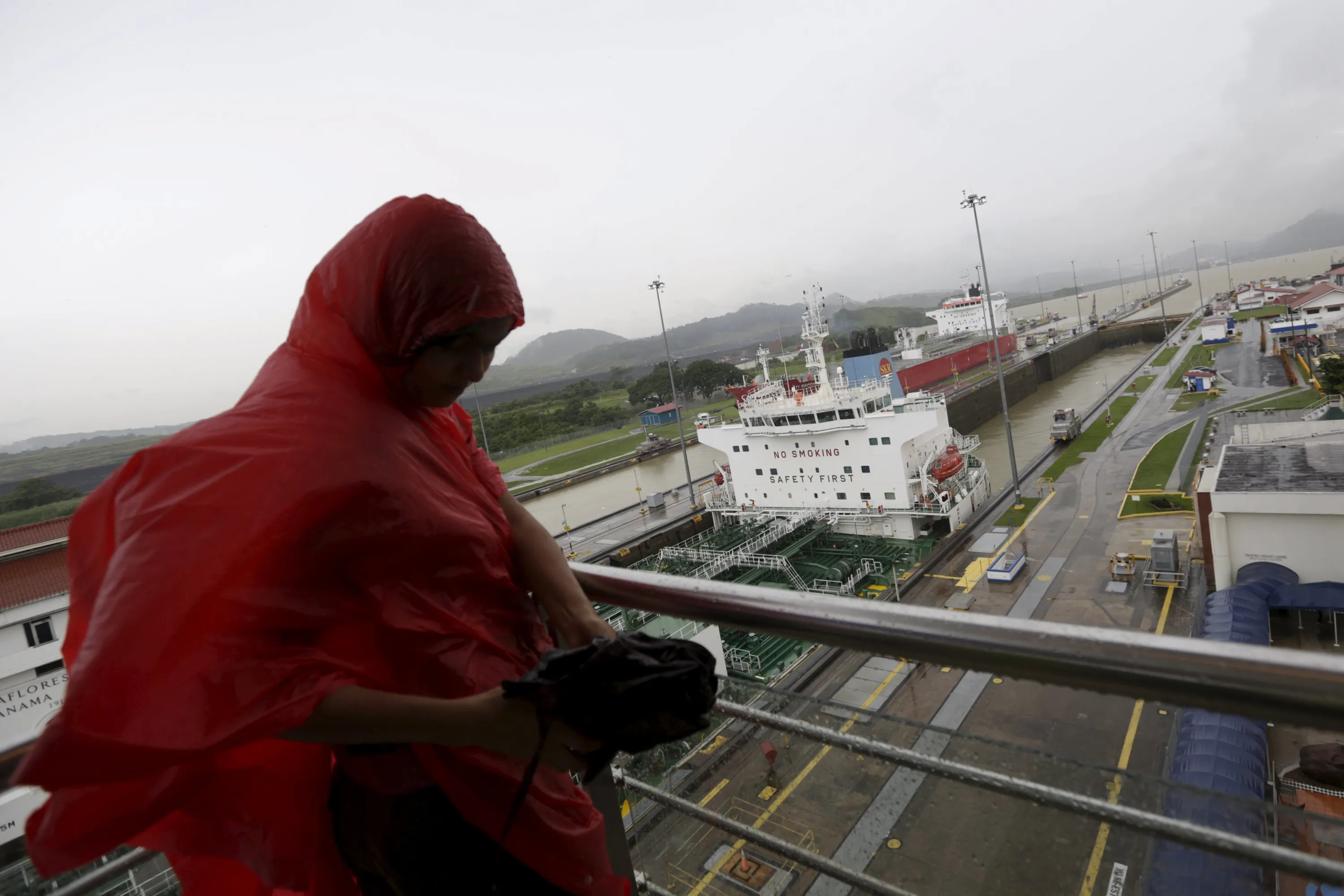 A visitor stands in the rain as a cargo ship navigates through the Miraflores locks of the Panama Canal, during the 101st anniversary of the waterway's opening, in Panama City August 15, 2015. (Photo by Carlos Jasso/Reuters)