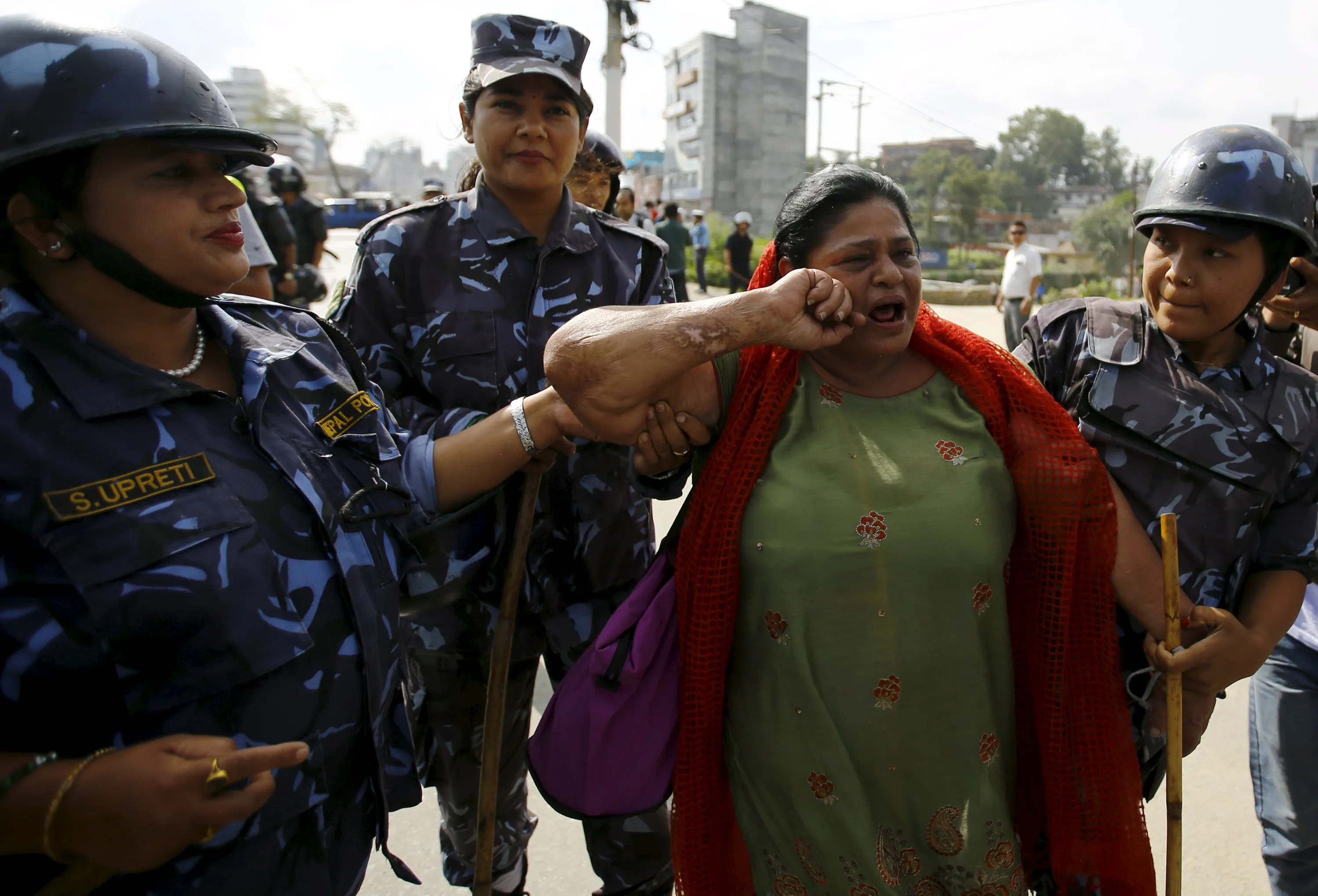 Nepalese police detain a protester during a general strike organised by a 30-party alliance led by a hardline faction of former Maoist rebels, who are protesting against the draft of the new constitution, in Kathmandu, Nepal August 16, 2015. The group says that the draft is not inclusive and does not protect the rights of marginalised and underprivileged groups in the country. (Photo by Navesh Chitrakar/Reuters)