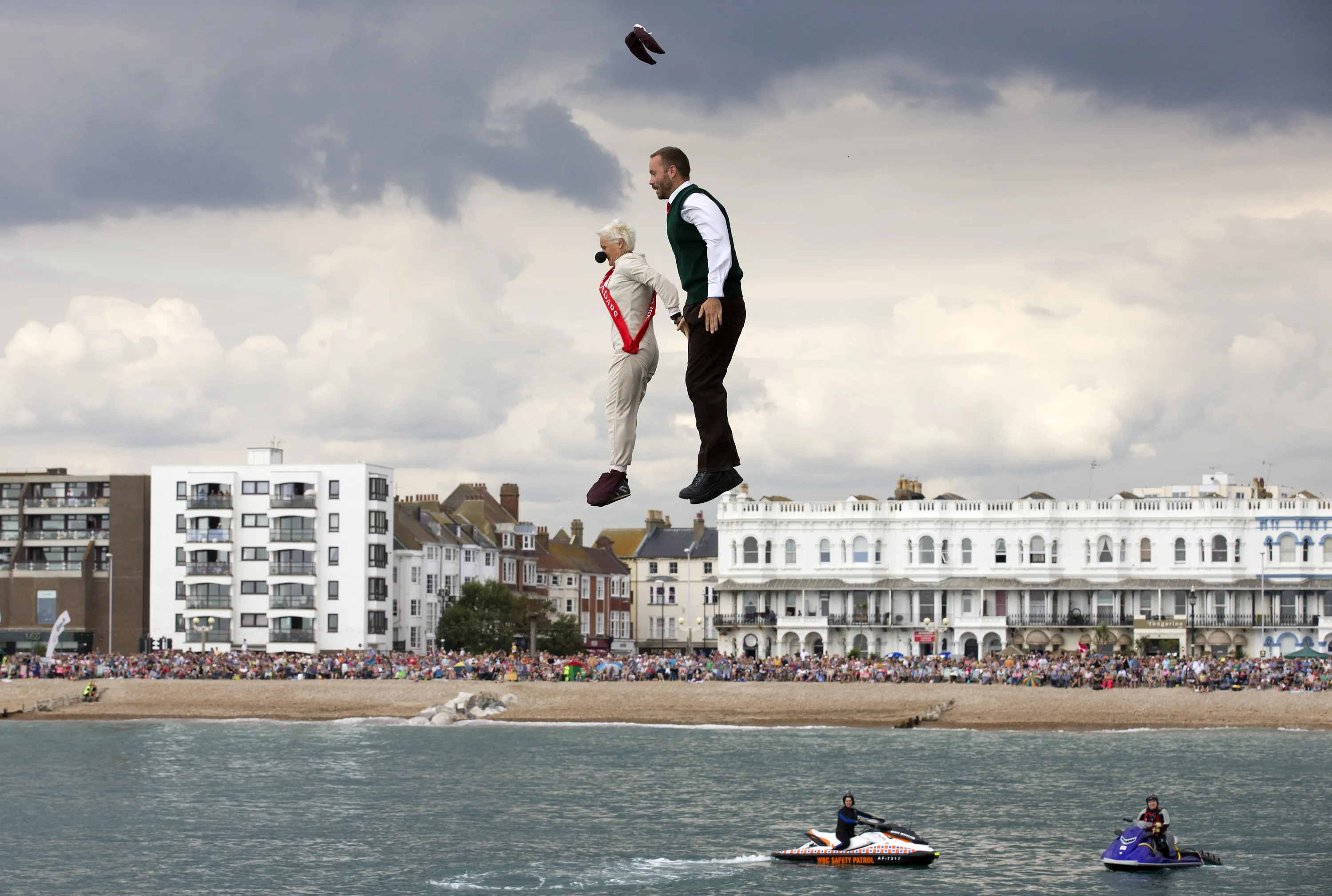 Competitors in fancy dress jump off Worthing Pier in West Sussex, Southern England on August 16, 2015, during the annual international birdman competition, a flight contest for human-powered flying machines held each summer. (Photo by Justin Tallis/AFP Photo)