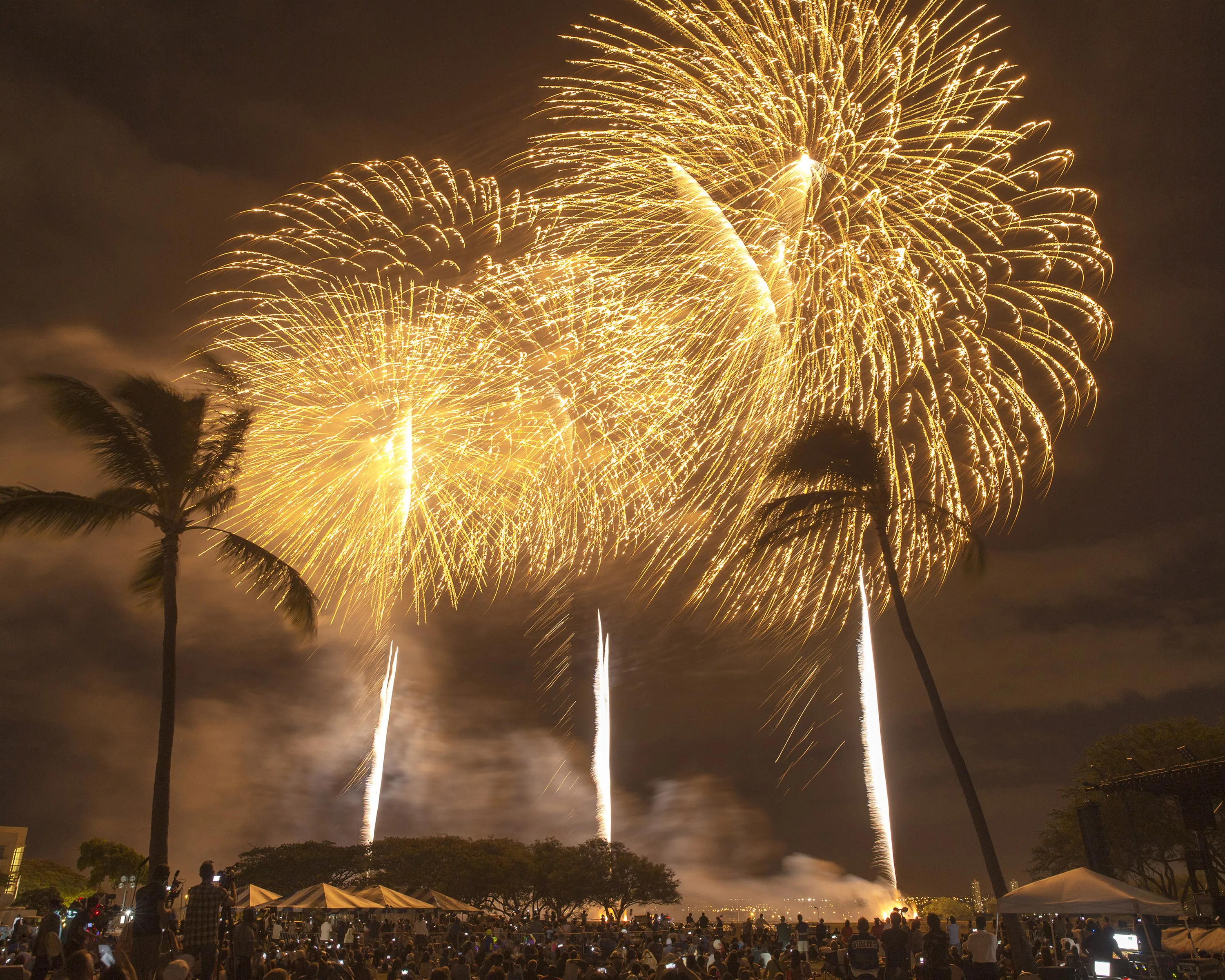 Fireworks from Nagaoka City, Japan, explode over Ford Island to celebrate the 70th anniversary of the end of World War II at Joint Base Pearl Harbor-Hickam Hawaii, Saturday, August 15, 2015, in Honolulu. (Photo by Marco Garcia/AP Photo)