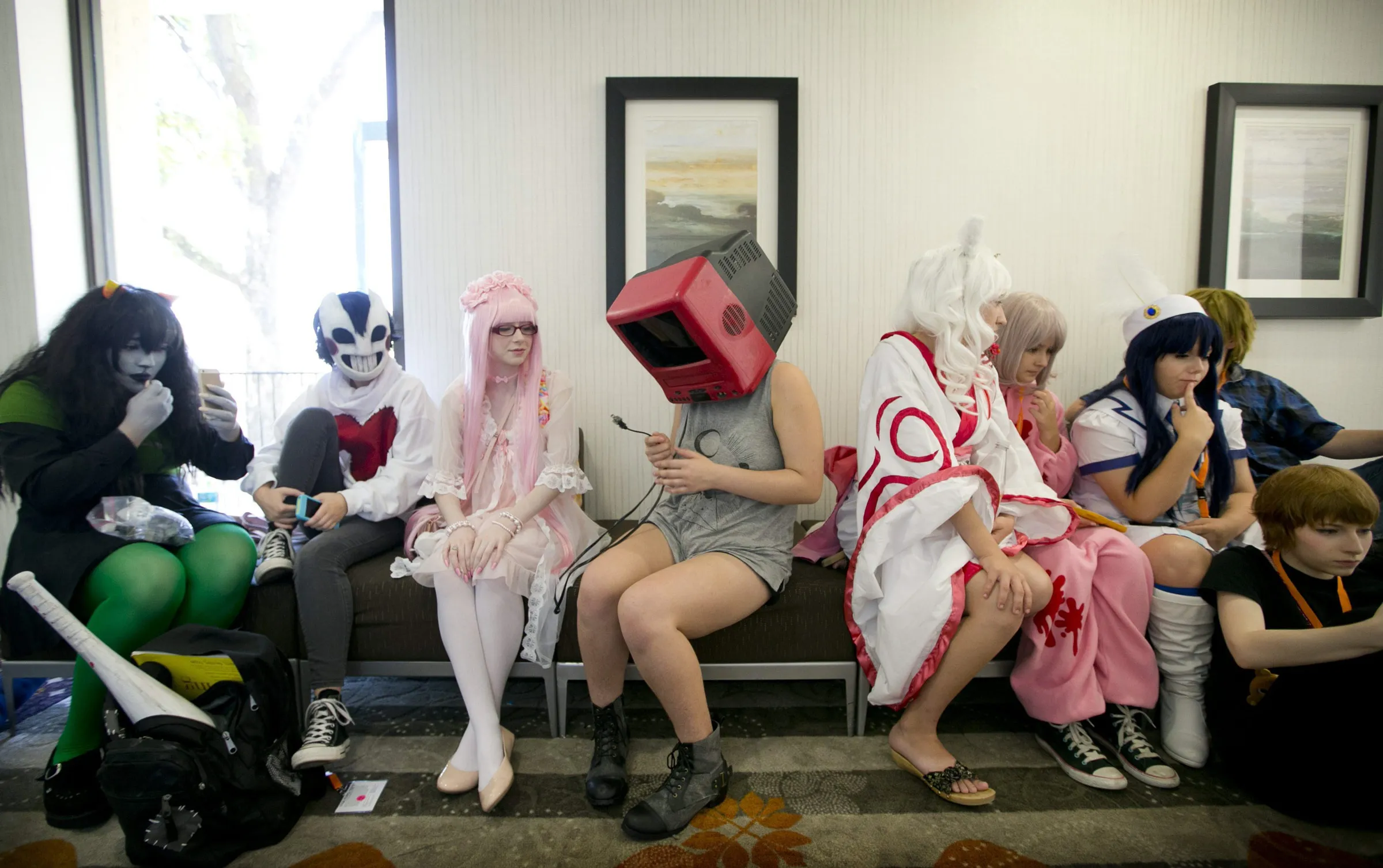 Darby Doran, center, 16, of Cedar Park, considers plugging in her head at Anime Orverload at a Holiday Inn in Austin, Texas, on Sunday, August 16, 2015. The 7th annual Anime Overload is a gathering of about a thousand fans of Japanese animation and pop culture. The three-day event featured a costume contest, screenings, gaming and vendors. (Photo by Jay Janner/Austin American-Statesman via AP Photo)