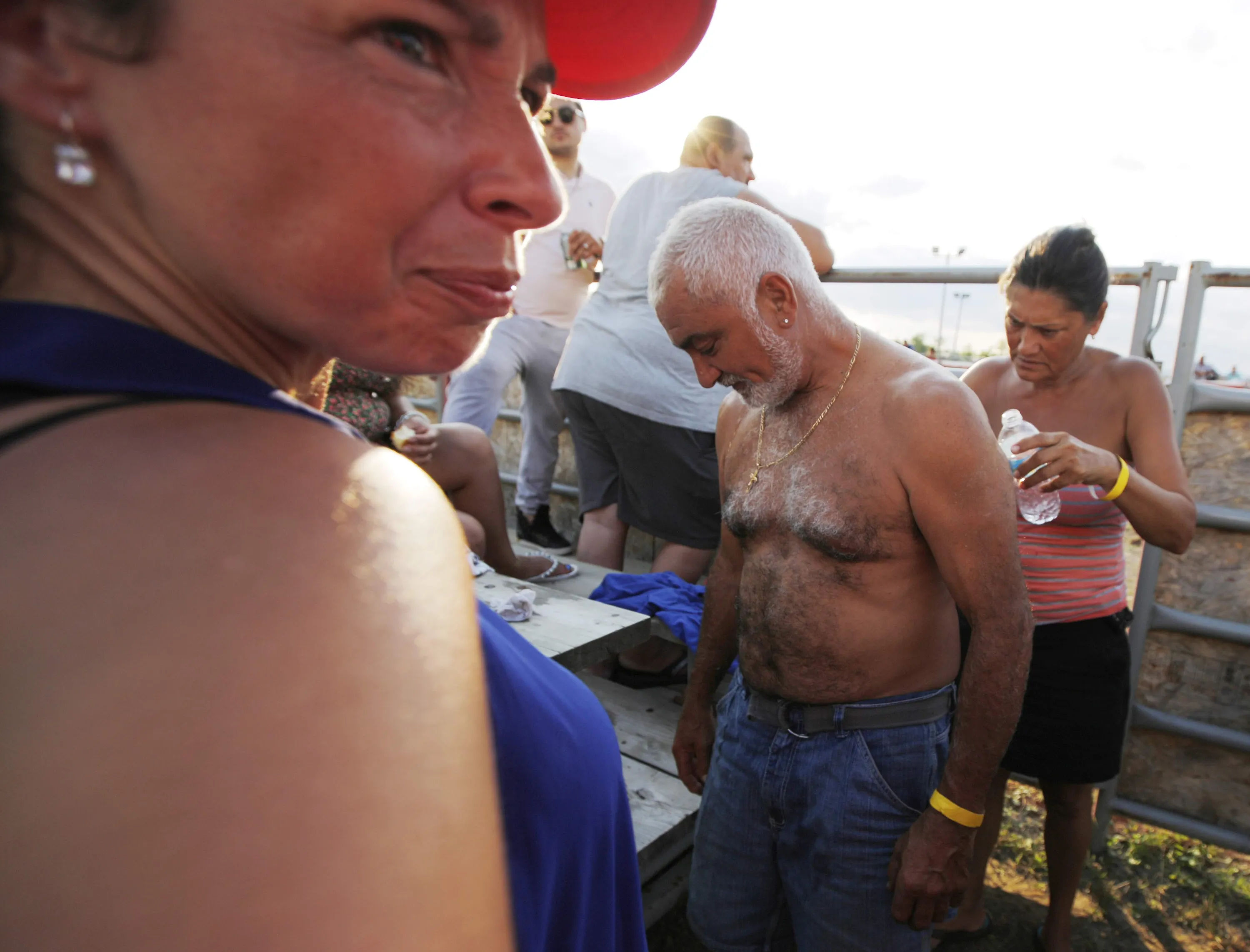 Bolino Silveira (C), who emigrated from the Azores to Mississauga, Ontario, has his scratches examined after falling at an Azorean “tourada a corda” (bullfight by rope) in Brampton, Ontario August 15, 2015. (Photo by Chris Helgren/Reuters)