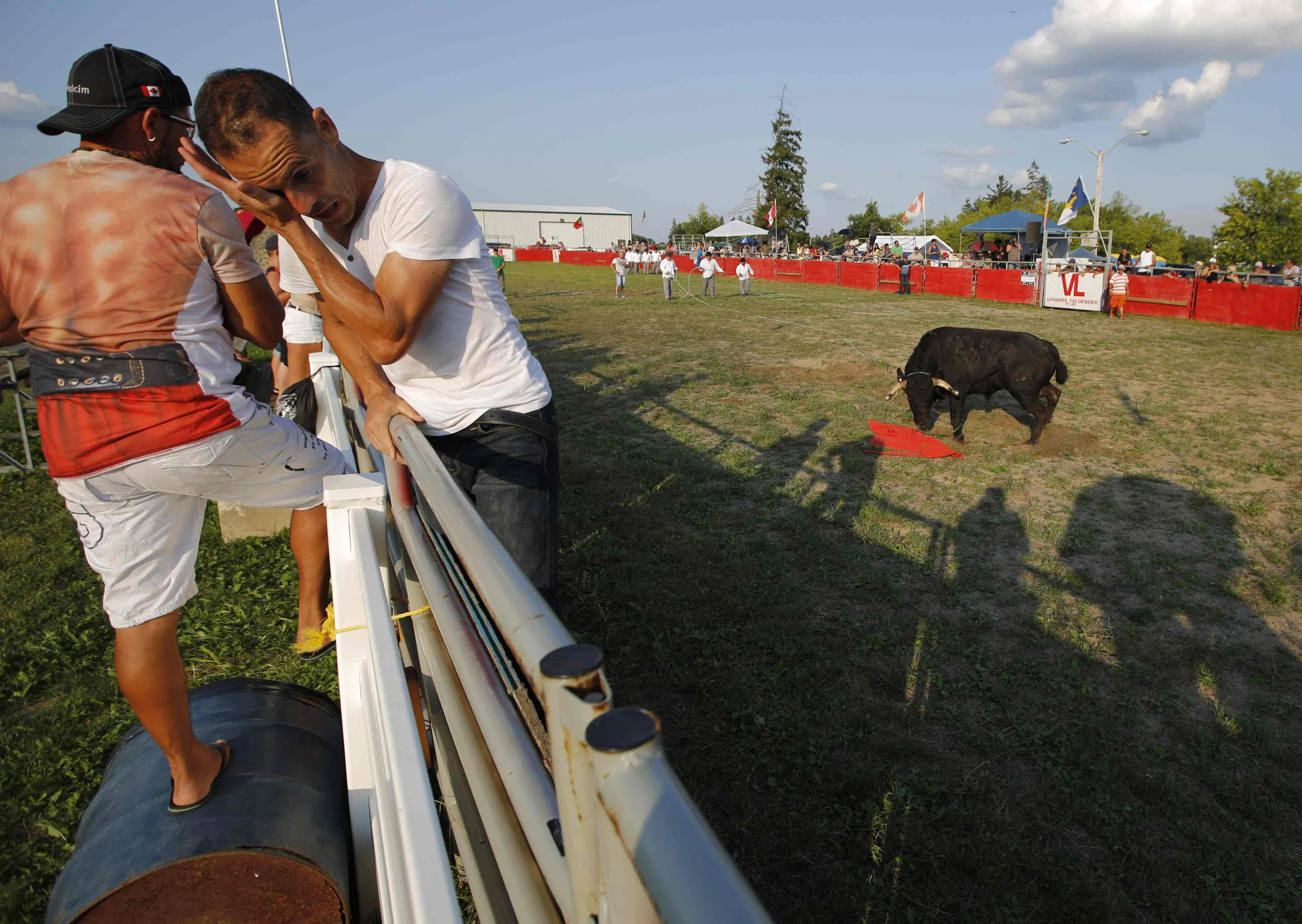 Matador Marco Espinola, who emigrated two years ago from the Azores, wipes sand kicked into his eyes by a bull during an Azorean “tourada a corda” (bullfight by rope) in Brampton, Ontario August 15, 2015. (Photo by Chris Helgren/Reuters)