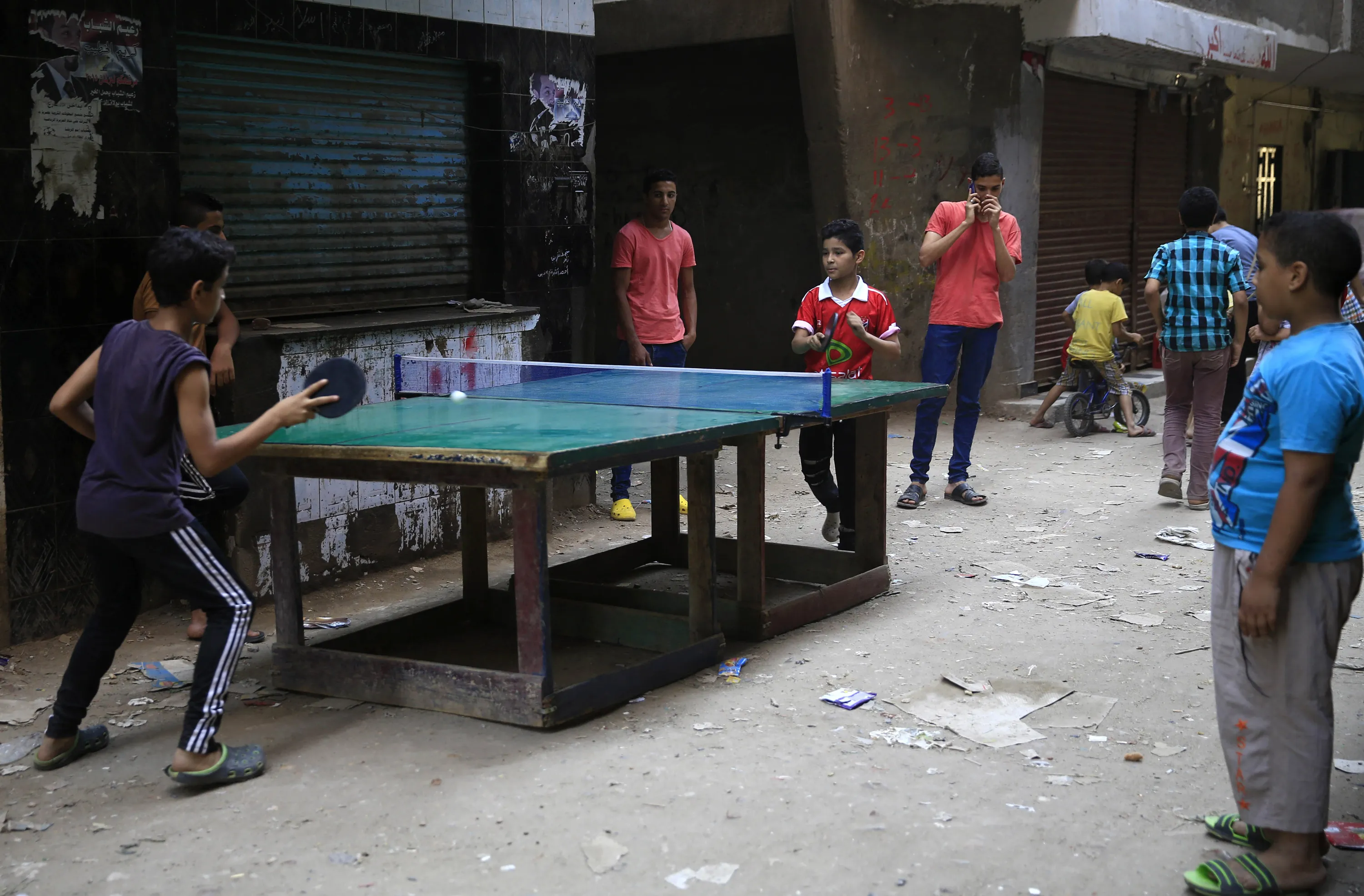 Egyptian boys play table tennis in an alleyway at the Boulaq El Dakrour district of Giza, near Cairo, Egypt, Sunday, July 5, 2015. (AP Photo/Hassan Ammar)