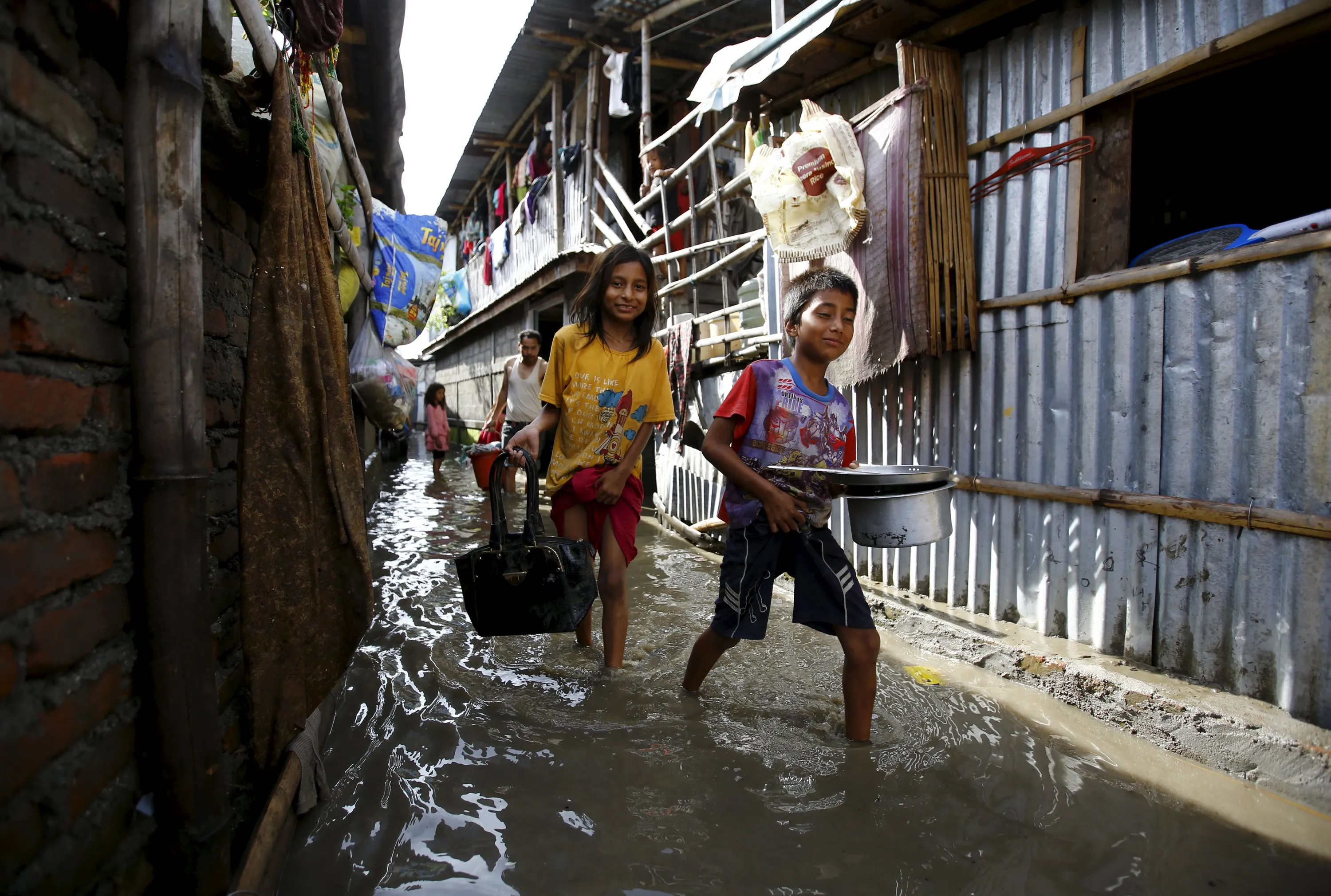 Children holding their belongings walk along an alley after floodwaters caused by heavy rainfall flowing from the swollen Bagmati River entered a slum in Kathmandu, Nepal August 17, 2015. (Photo by Navesh Chitrakar/Reuters)