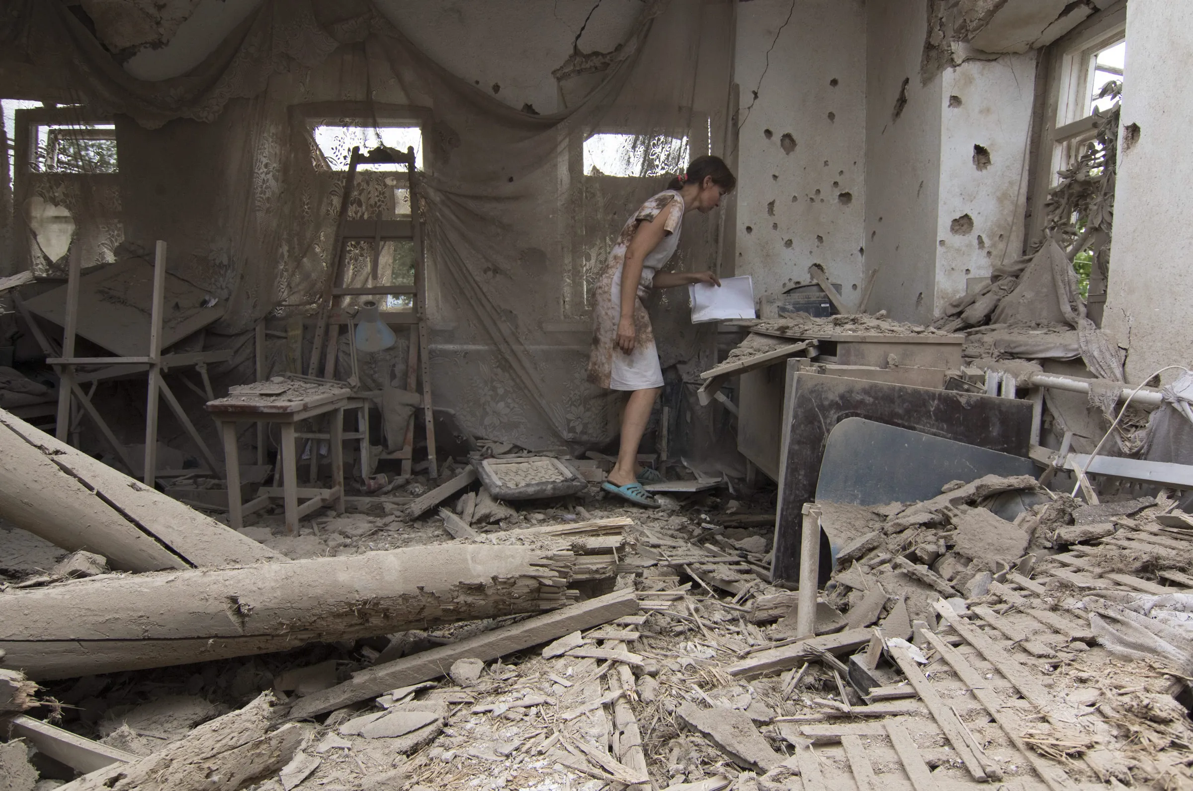 A woman stands on debris in a destroyed house after recent shelling, on a territory controlled by Ukrainian army, in Sartana village, near the eastern city of Mariupol, Ukraine, 17 August 2015. The Ukrainian military and pro-Russian separatists have exchanged heavy artillery fire despite a ceasefire that banned such weapons from the front lines, the Organization for Security and Cooperation in Europe (OSCE) said 13 August. (Photo by Sergey Vaganov/EPA)