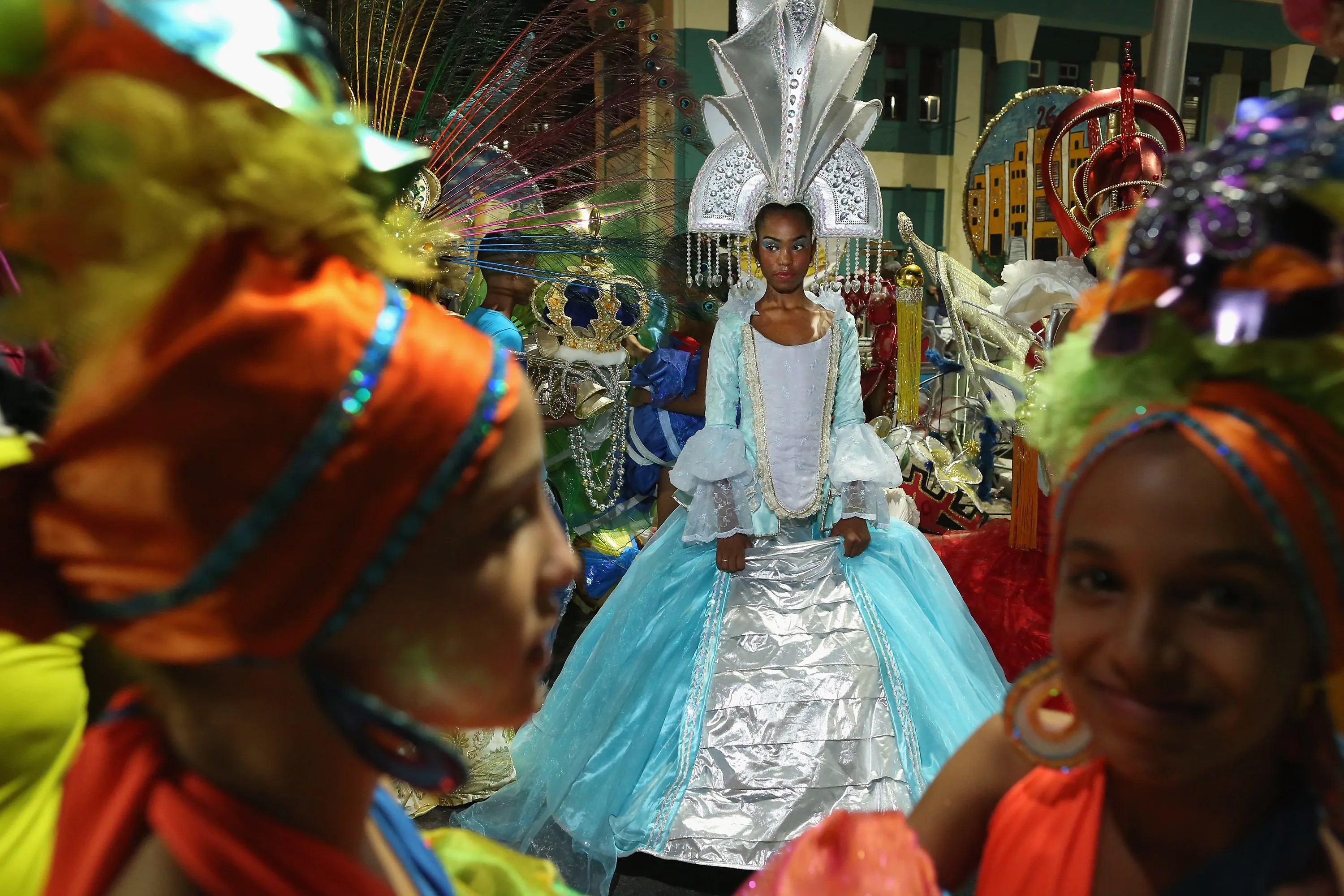 Young performers wear elaborate and colorful costumes as they prepare to dance and march in the annual Carnival parade along the Malecon seawall boulevard August 14, 2015 in Havana, Cuba. The origins of the Havana Carnival can be traced back to 1576 when freed slaves were given permission by the town council of Havana to participate in the procession of the Corpus Christi. (Photo by Chip Somodevilla/Getty Images)