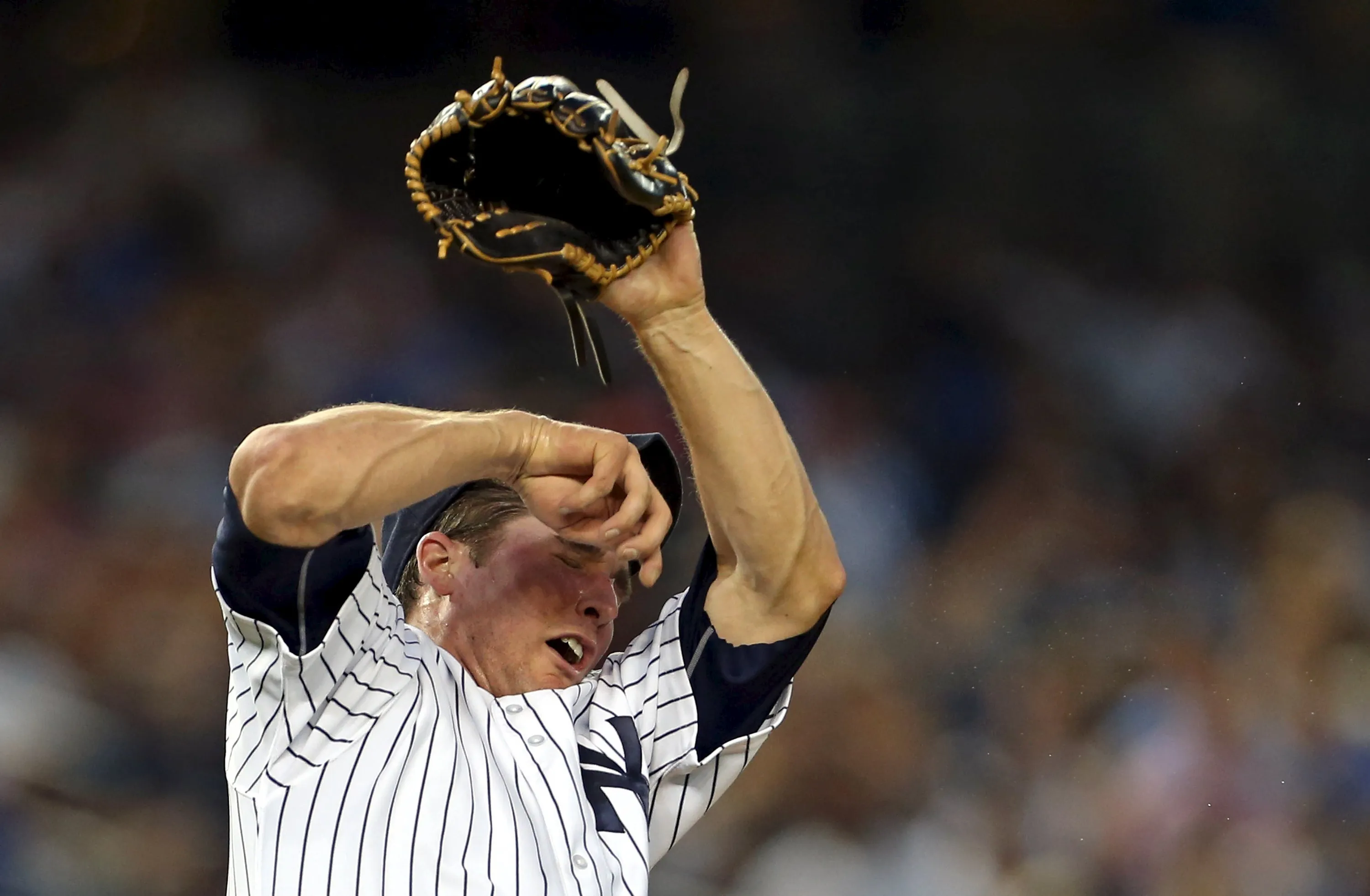August 17, 2015; Bronx, NY, USA; New York Yankees starting pitcher Bryan Mitchell (55) reacts after being hit in the face by a baseball against the Minnesota Twins during the second inning at Yankee Stadium. (Photo by Adam Hunger/USA TODAY Sports)