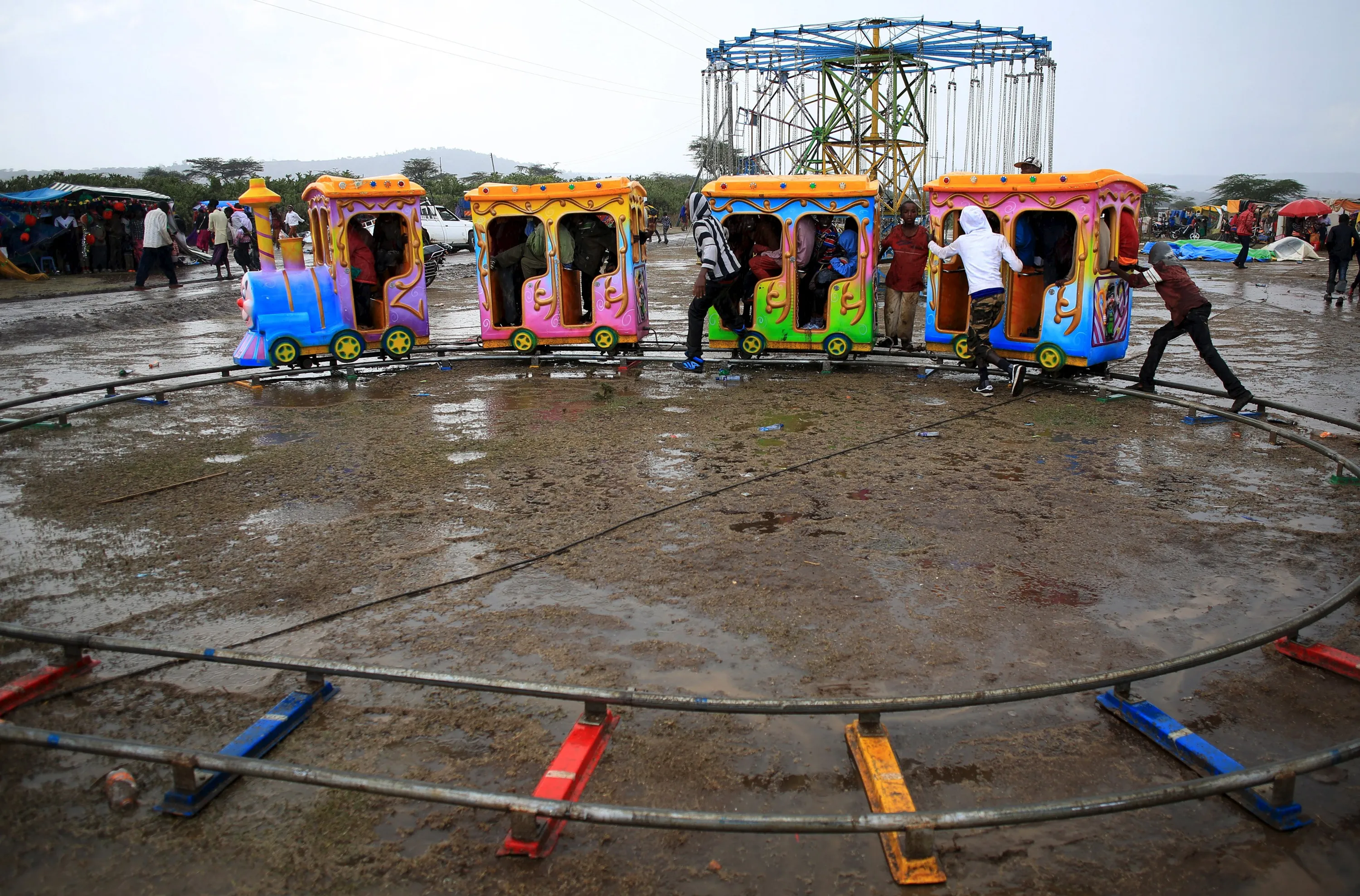 Children play with an amusement train ride during heavy rain during the Maralal Camel Derby, Kenya, August 15, 2015. (Photo by Goran Tomasevic/Reuters)