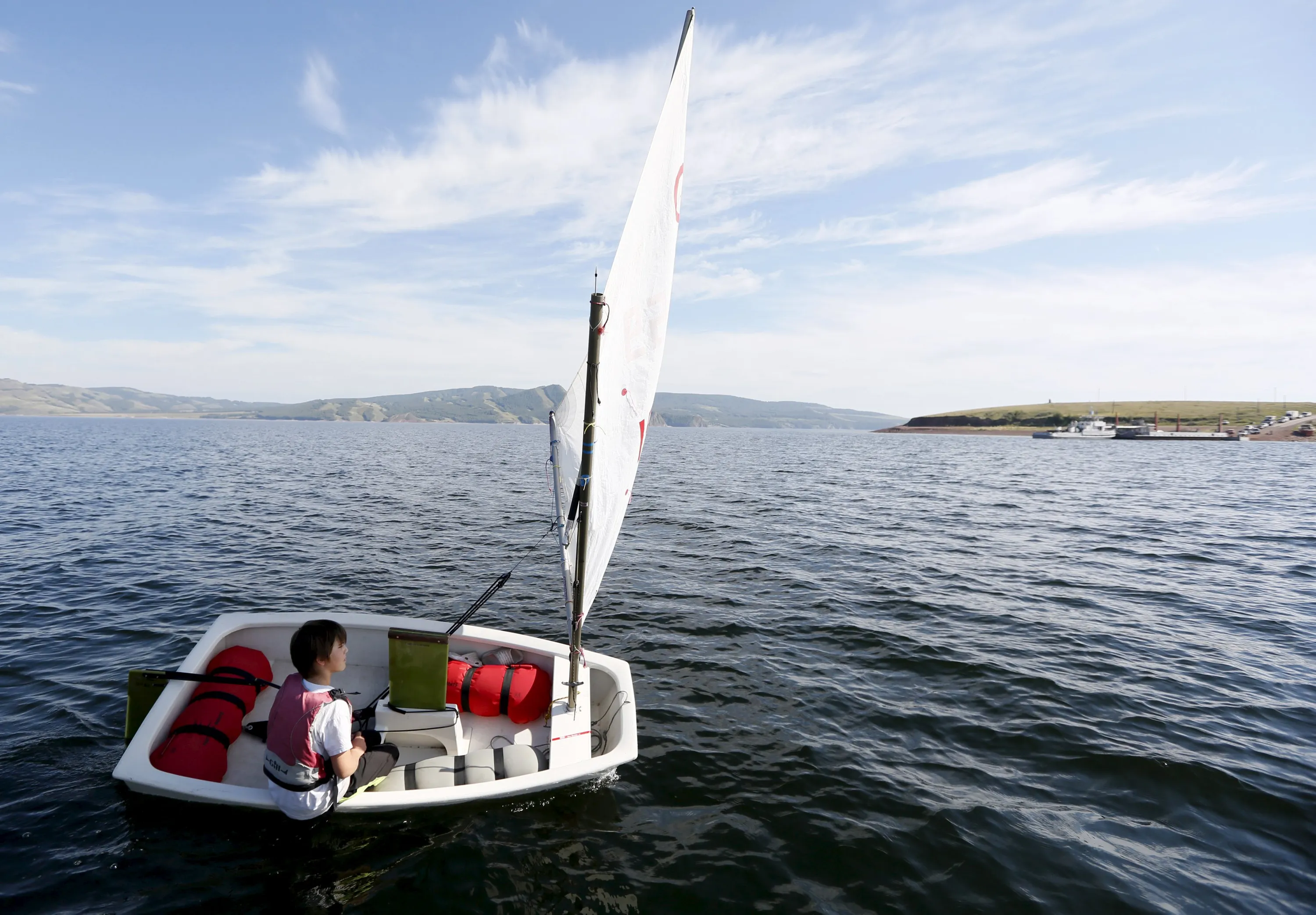 A boy sails his Optimist international class single-handed sailing dinghy for children along the Yenisei River near the settlement of Novosyolovo, south of the Siberian city of Krasnoyarsk, Russia, August 19, 2015. (Photo by Ilya Naymushin/Reuters)