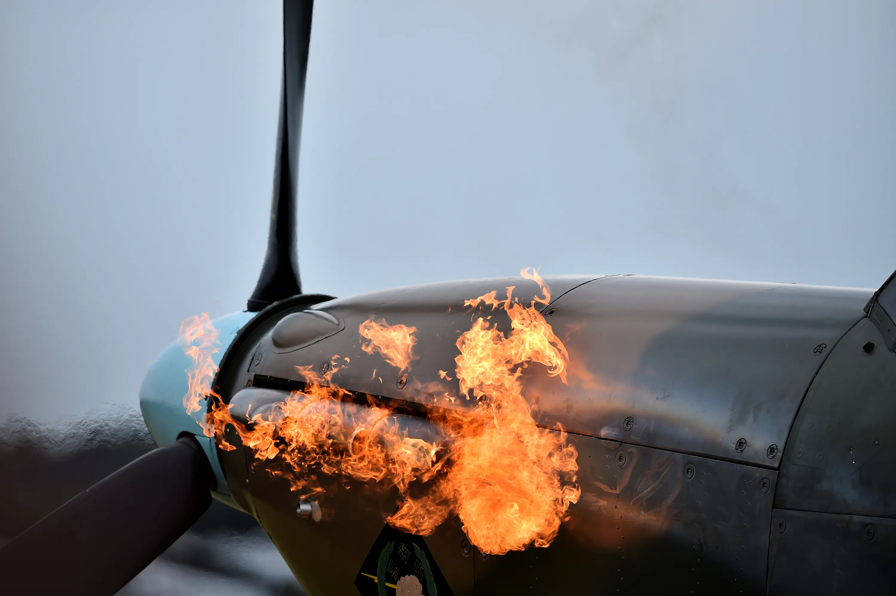 Flames are seen from the exhaust pipes of a Hurricane aircraft as the engine is started before taking off from Biggin Hill airfield in Kent, on August 18, 2015. World War II aircraft including 18 Spitfires and six Hurricanes flew over southeast England to mark the 75th anniversary of the “hardest day” of the Battle of Britain. August 18, 1940, became known as the “hardest day” of the Battle of Britain, as British planes experienced the most intense conflict with the German Luftwaffe above the skies of southern England, with both sides losing a total of 136 aircraft in one day. (Photo by Ben Stansall/AFP Photo)