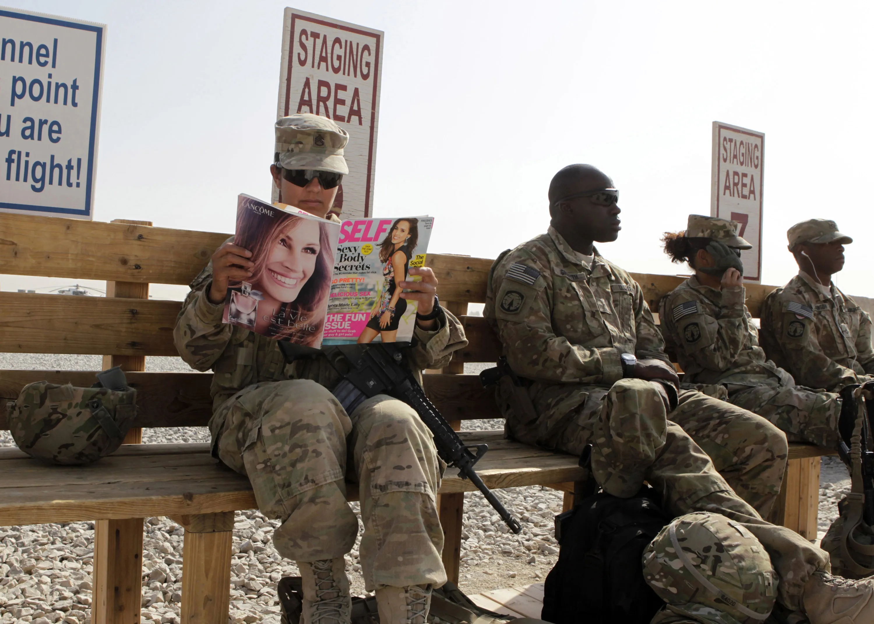 U.S. Army soldier SSG Norma Gonzales of 426 Civil Affairs Battalion reads a magazine next to fellow soldiers while waiting to be ferried by a helicopter to different U.S. military bases in Kandahar, southern Afghanistan October 11, 2012. (Photo by Erik De Castro/Reuters)