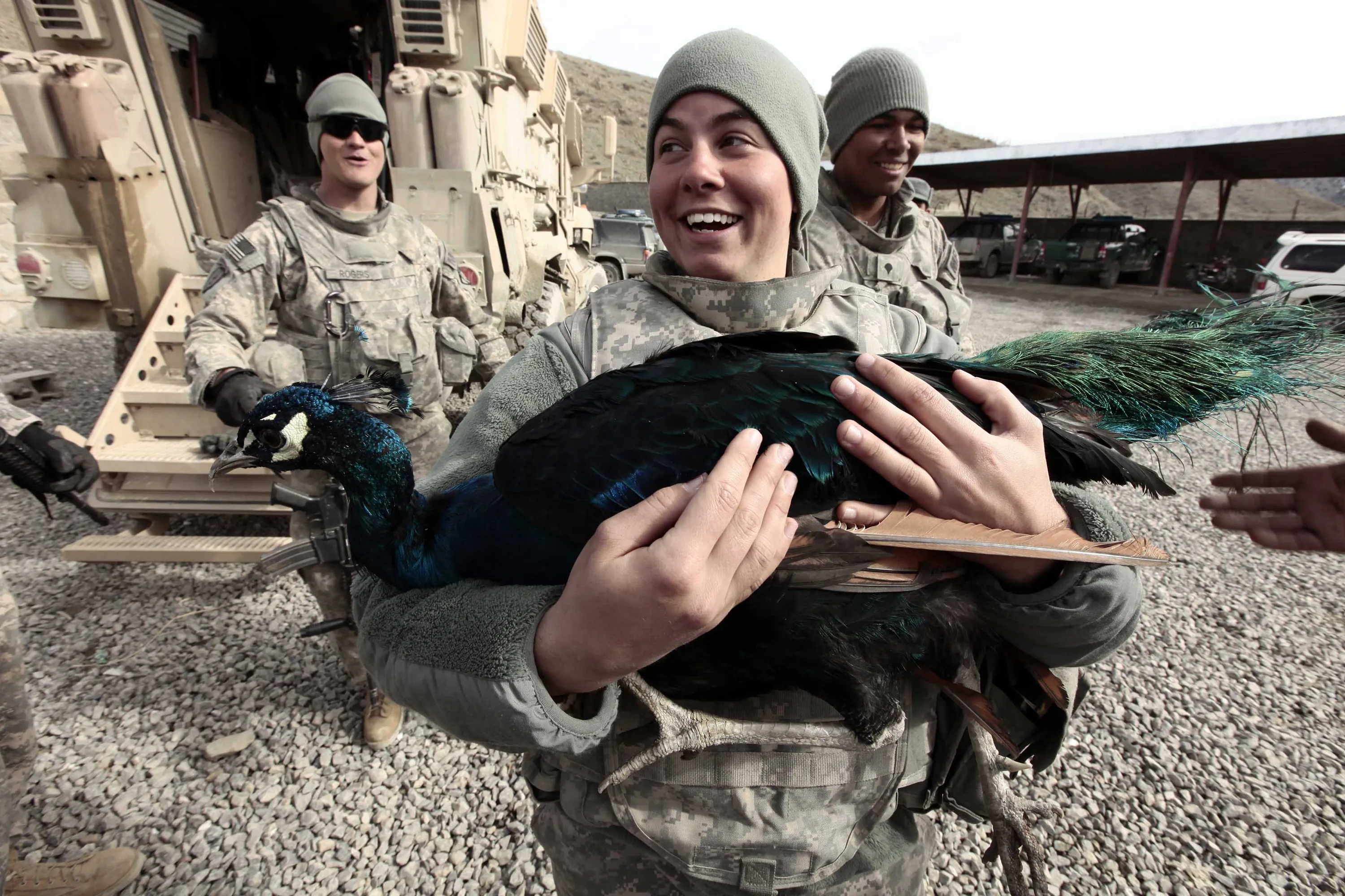 U.S Army PFC Jessica Harmon from Task Force Denali 92 MP carries a peacock at Wazi-Zadram police station in Paktya province, Afghanistan December 11, 2009. (Photo by Zohra Bensemra/Reuters)