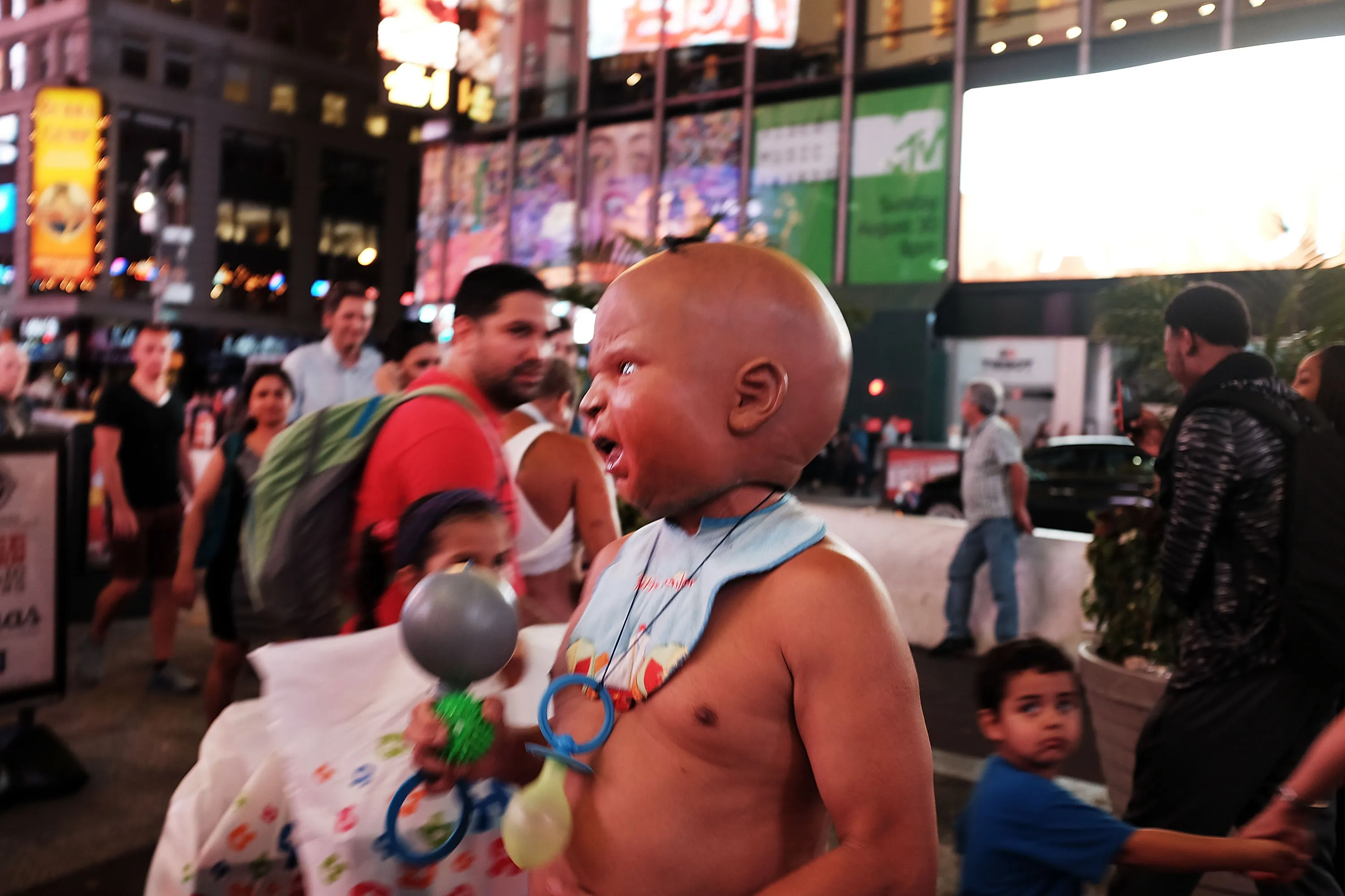 A street performer works for tips in Times Square on August 19, 2015 in New York City. As the iconic Times Square continues to draw tourists with its entertaining and carnival like atmosphere, New York Mayor Bill de Blasio has announced that the city is preparing to address the issue of topless and painted women who pose for pictures while soliciting tips. In recent years Times Square has seen an influx of performers who dress in a variety of costumes and sometimes become aggressive with the public. The semi-nude women, who call themselves desnudas, Spanish for naked, and pose for photos in exchange for tips, are a new addition to the colourful environment. (Photo by Spencer Platt/Getty Images)