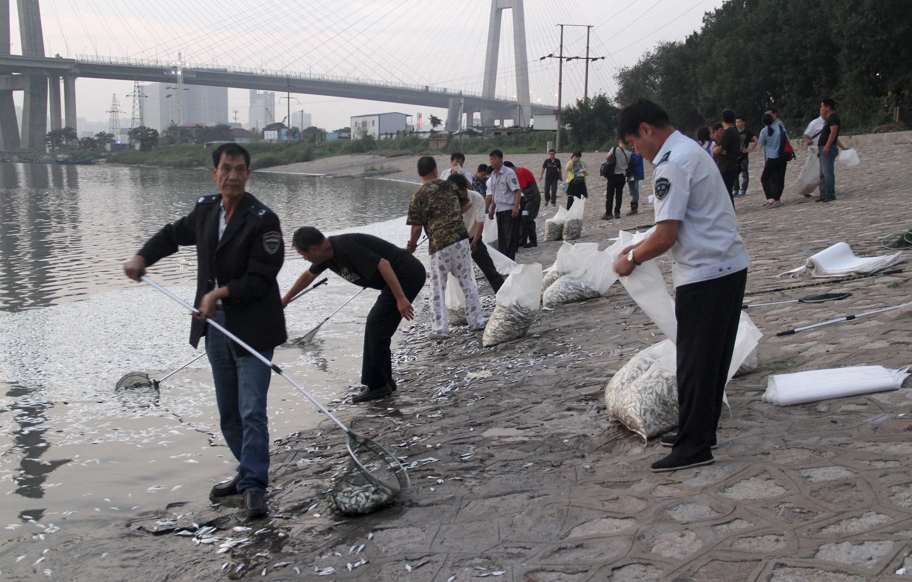 Workers remove dead fish from the Haihe river at Binhai new district in Tianjin, China, August 20, 2015. (Photo by Reuters/Stringer)