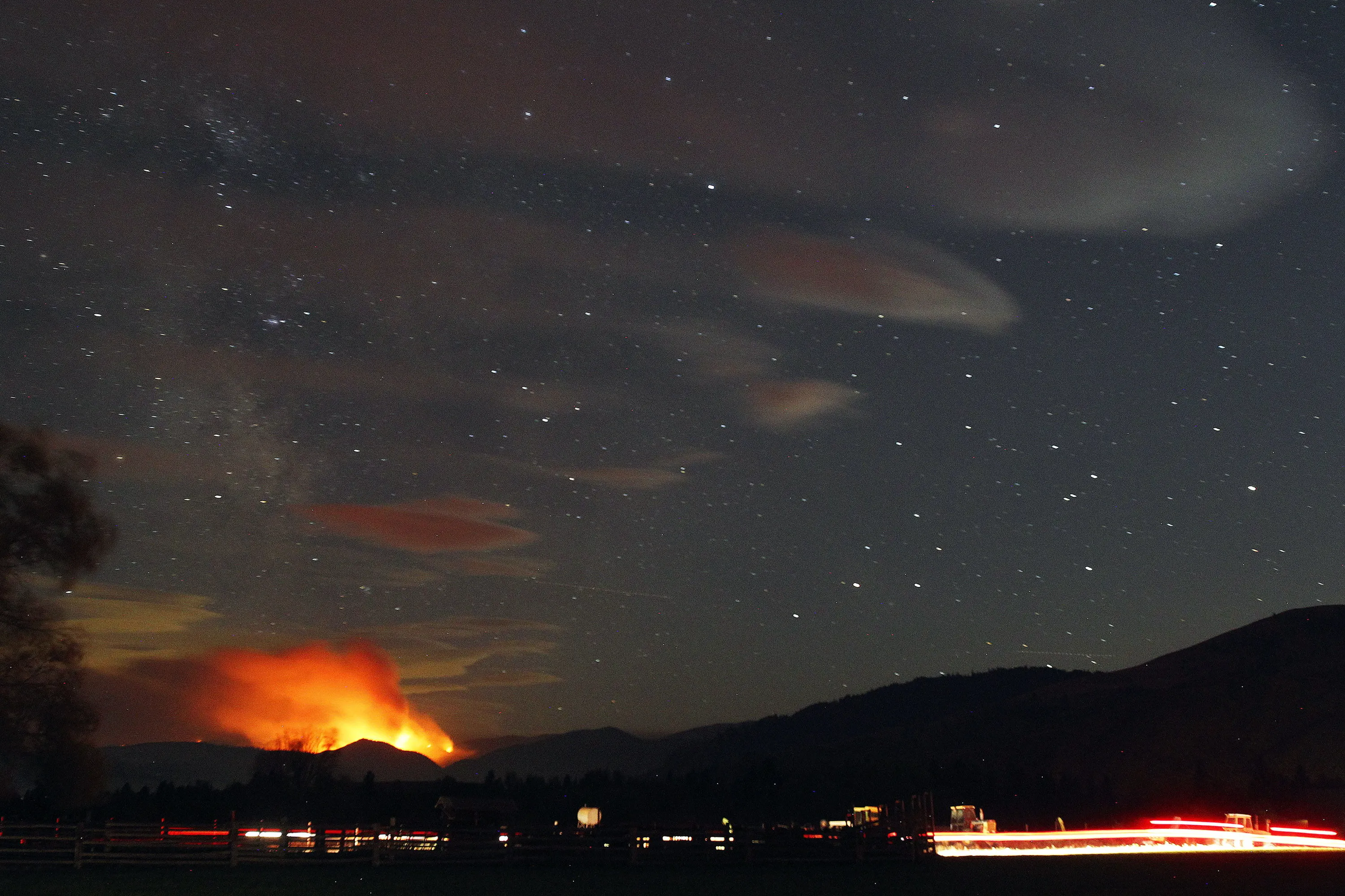 In this photo taken with a long shutter speed on Thursday night, August 20, 2015, the Black Canyon fire lights up the night sky in Chelan, Wash. Washington Gov. Jay Inslee says his state is facing an “unprecedented cataclysm” from the many fires raging across the region. (Photo by Genna Martin/The Herald via AP Photo)