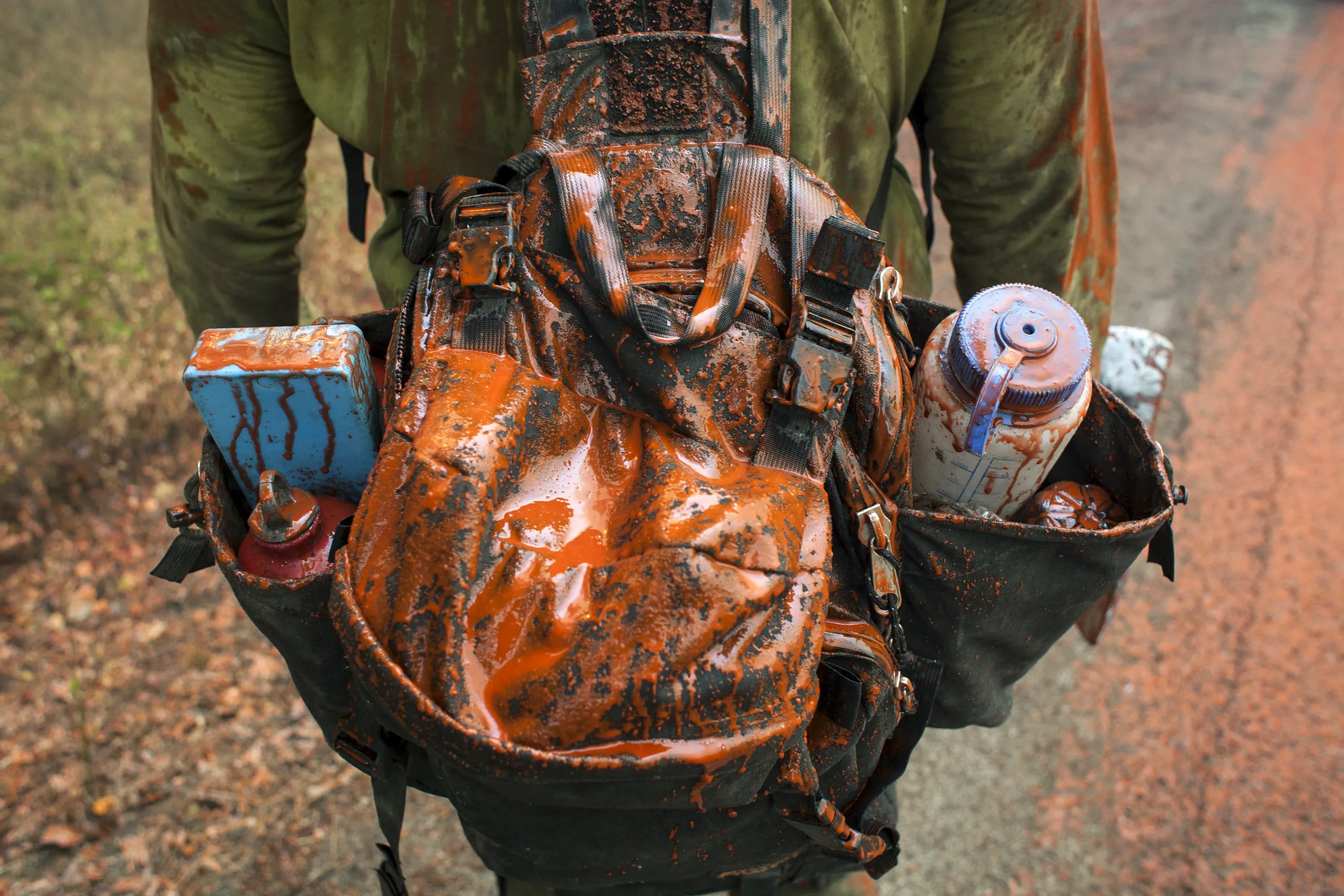 A firefighter's backpack is seen covered in fire retardant dropped from an airplane while battling the Twisp River fire near Twisp, Washington August 20, 2015. (Photo by David Ryder/Reuters)