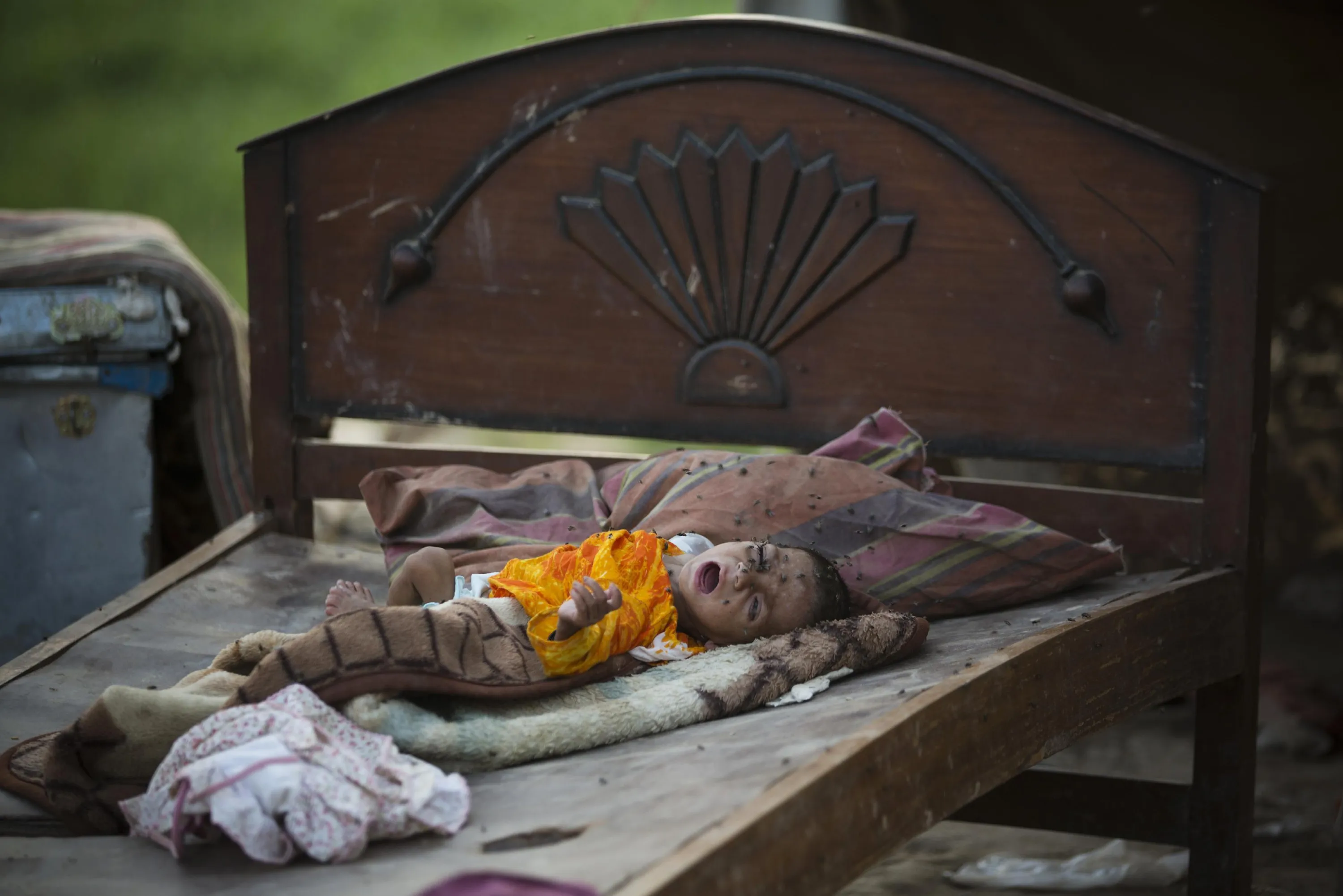 A child of a Pakistani nomad family sleeps outside her makeshift home as she gets swamped with flies in Islamabad, Pakistan, Wednesday, August 5, 2015. Some Pakistanis, mostly nomad families, live in unhygienic conditions in suburbs and earn their living by selling balloons and toys. (Photo by B. K. Bangash/AP Photo)