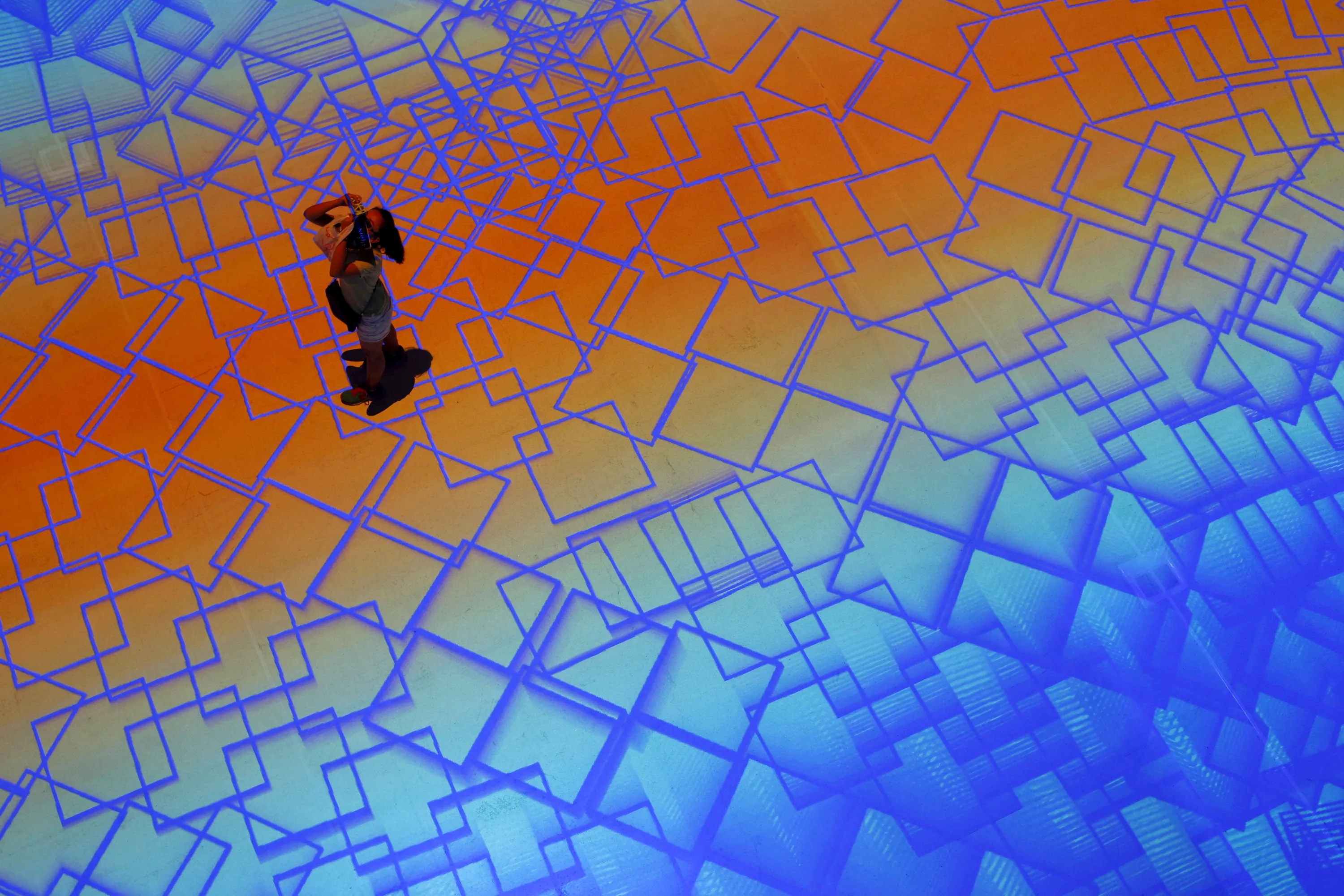 A woman interacts with “Pixel Wave 2015” a projection art installation by France's Miguel Chevalier and local designers Carolyn Kan and Depression that features geometric patterns that react to movements and interactions of people, during the Singapore Night Festival at the Singapore Design Center, August 21, 2015. (Photo by Edgar Su/Reuters)