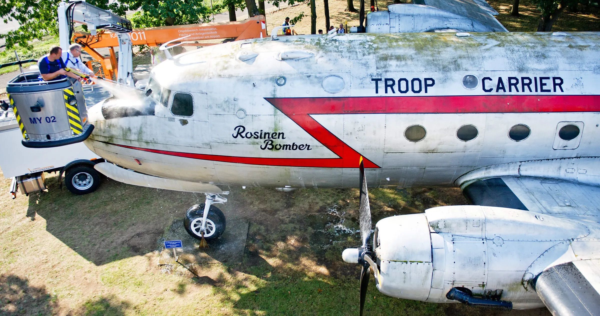 Olaf Meixler (L), employee of cleaning company “N*ICE”, along with co-organiser Norbert Kandzorra (R), uses a high-pressure water jet to clean an old Douglas DC-4 at the Airlift Memorial at the airport in Frankfurt am Main, Germany, 21 August 2015. Airport operator Fraport AG intends to improve maintenance of the aircraft at the Airlift Memorial as well as ensure the long-term preservation of the entire monument. (Photo by Christoph Schmidt/EPA)