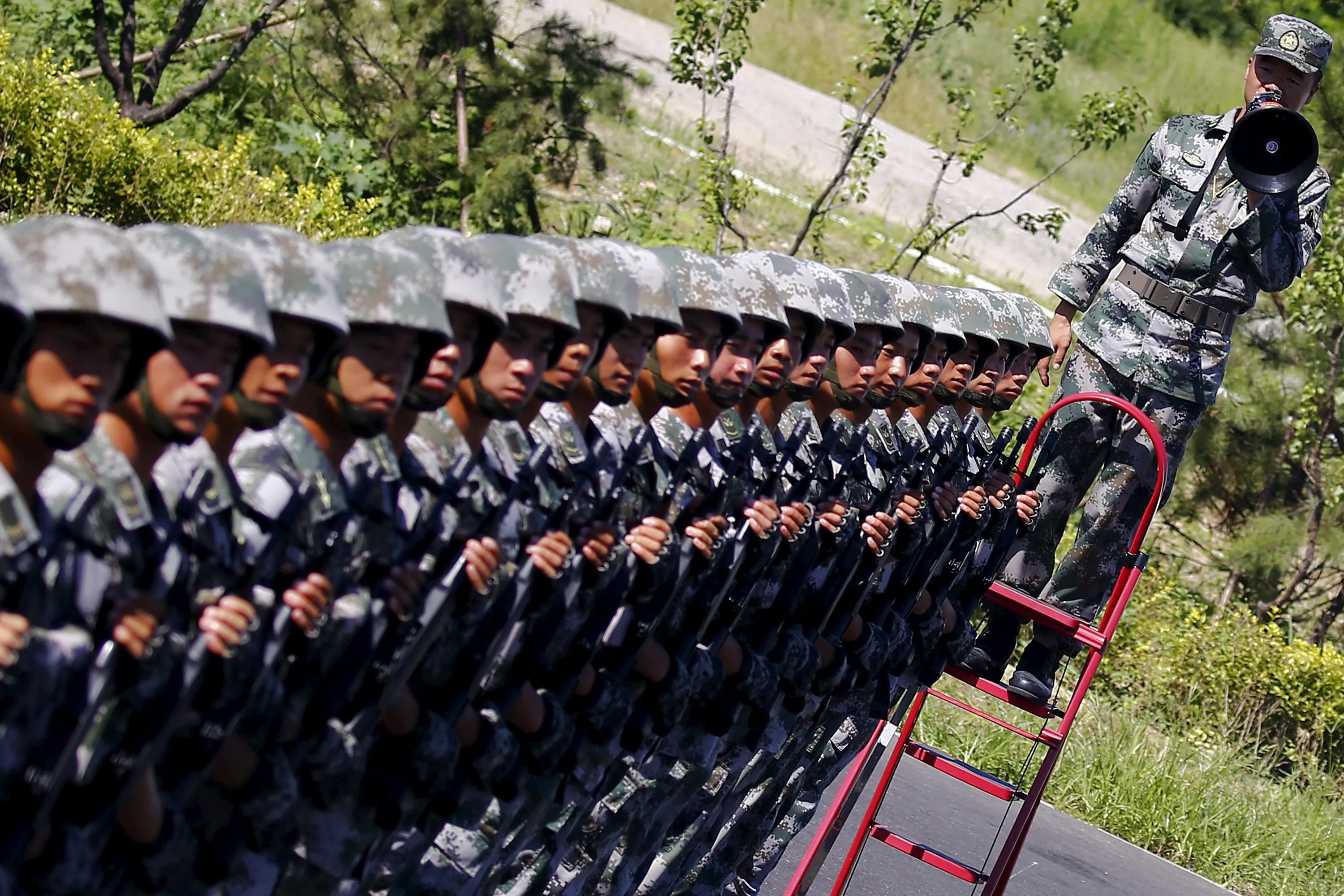An officer gives instructions as soldiers of China's People's Liberation Army rehearse during a training session for a military parade to mark the 70th anniversary of the end of the World War Two, at a military base in Beijing, China, August 22, 2015. (Photo by Damir Sagolj/Reuters)