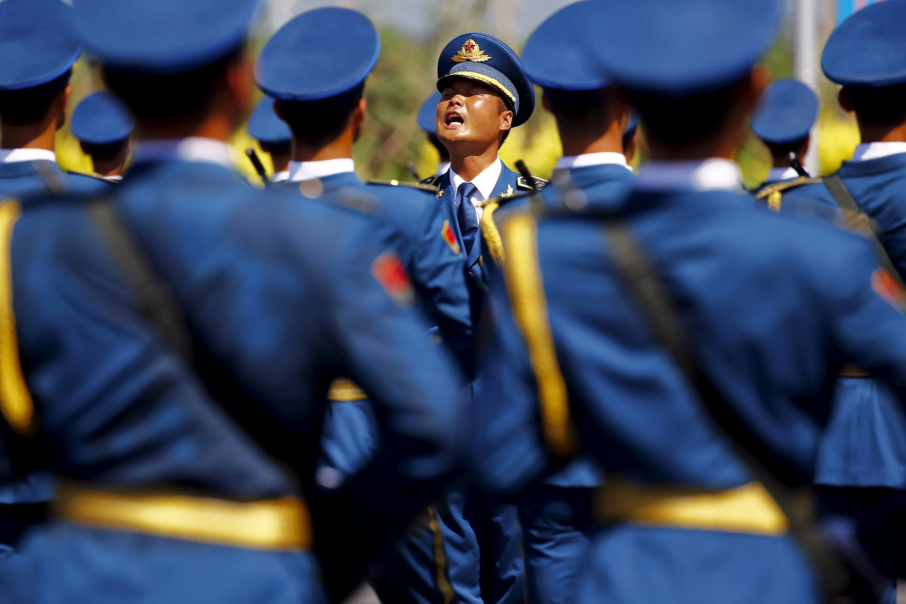 An officer shouts orders as soldiers of China's People's Liberation Army march during a training session for a military parade to mark the 70th anniversary of the end of World War Two, at a military base in Beijing, China, August 22, 2015. (Photo by Damir Sagolj/Reuters)