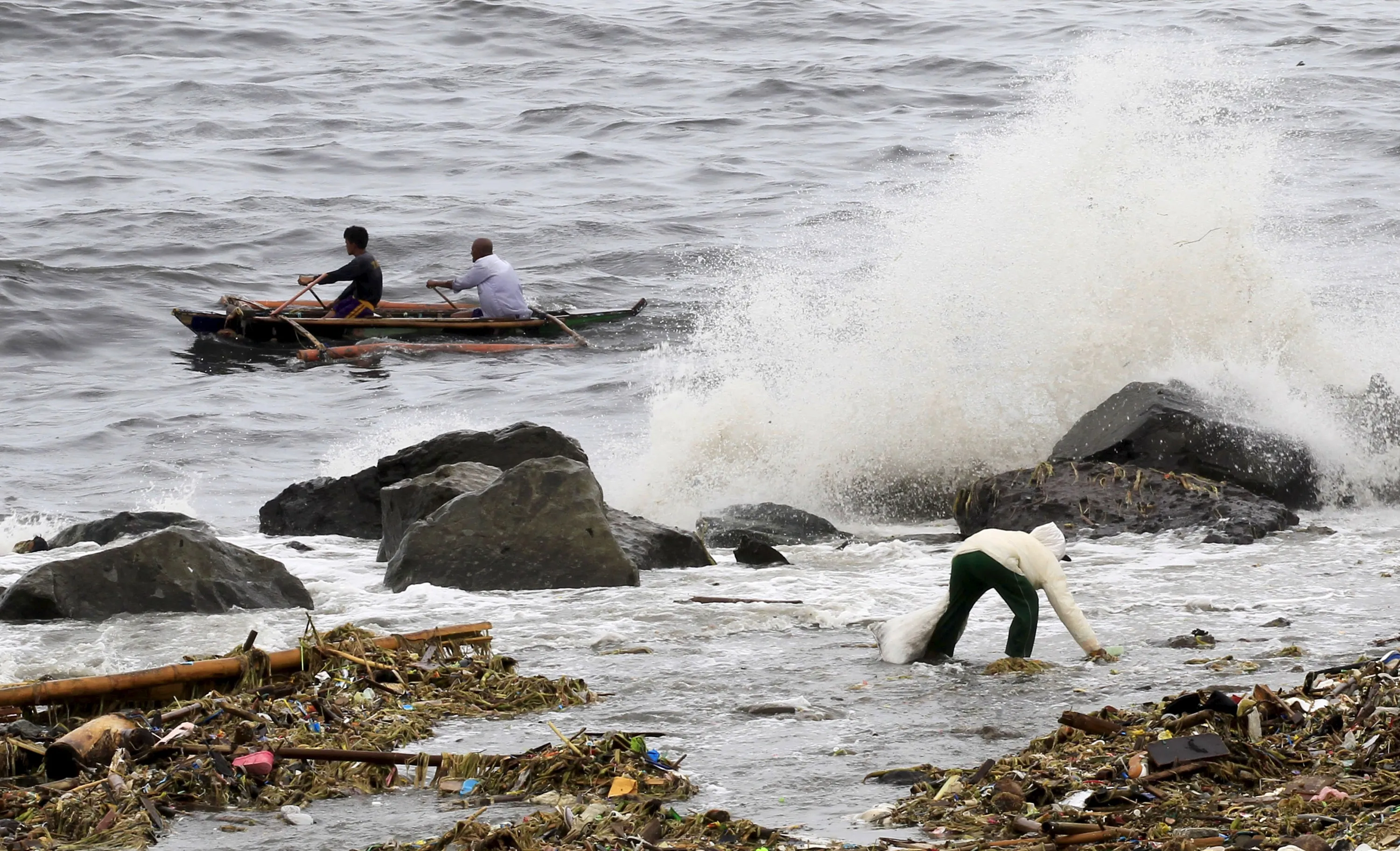 A woman collects recyclable materials floating in the sea, while big waves crash along the coastline due to strong winds brought by Typhoon Goni, locally named as Ineng, at Manila bay August 22, 2015. (Photo by Romeo Ranoco/Reuters)