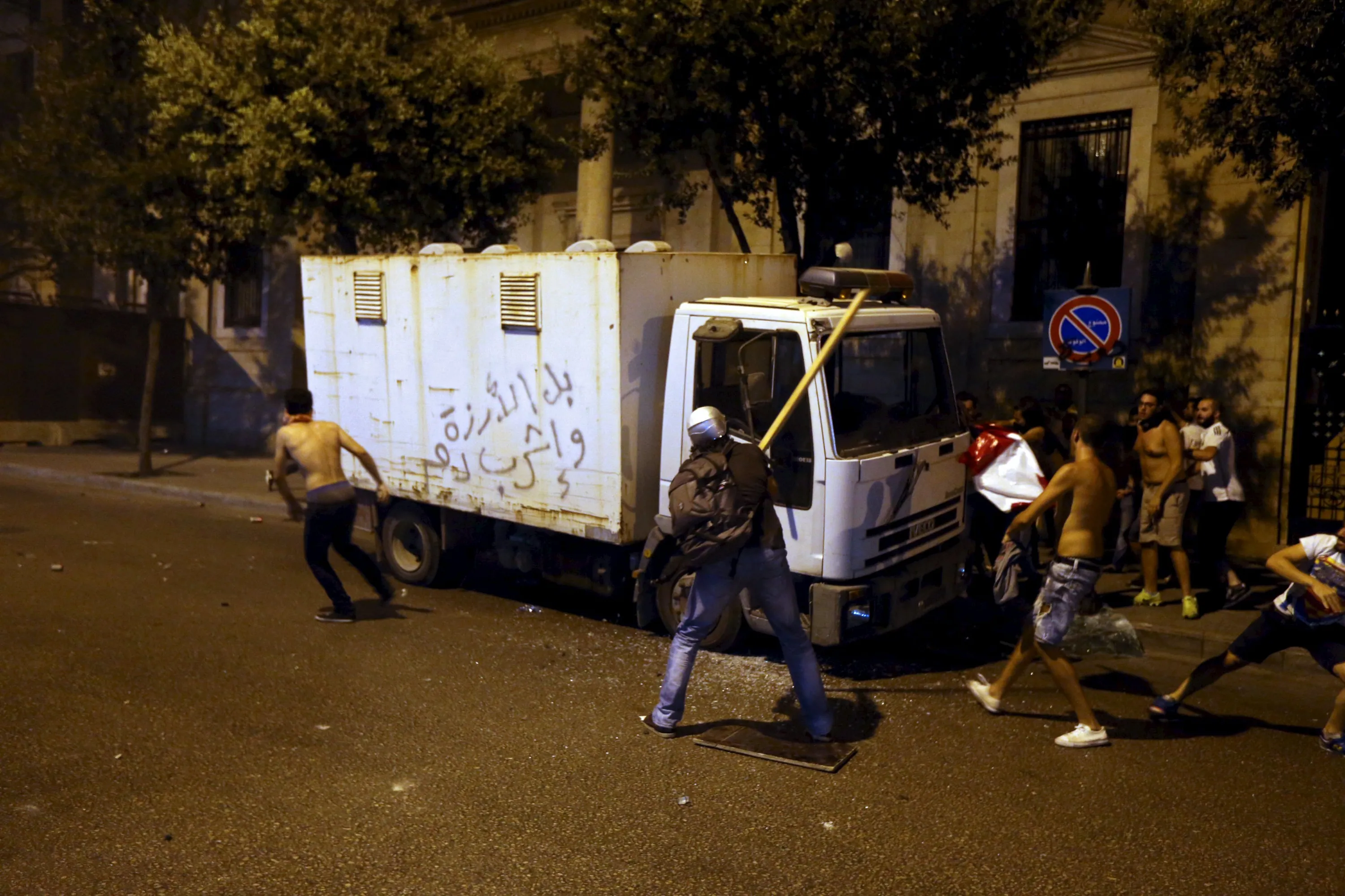 Protestors run during a protest against corruption and rubbish collection problems near the government palace in Beirut, August 22, 2015. The graffiti on the pick-up truck reads: “Wet the cedar tree, and drink blood”. (Photo by Hasan Shaaban/Reuters)